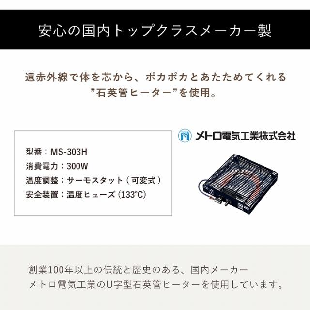 | 【台】 天板 低圧メラミン パーチクルボード 脚 ポリプロピレン 【ヒーター】 U字型石英管ヒーター(300W) 電源スイッチ付きコード3m 温度ヒューズ、無段階温度調節機能 サーモスタット内蔵 |