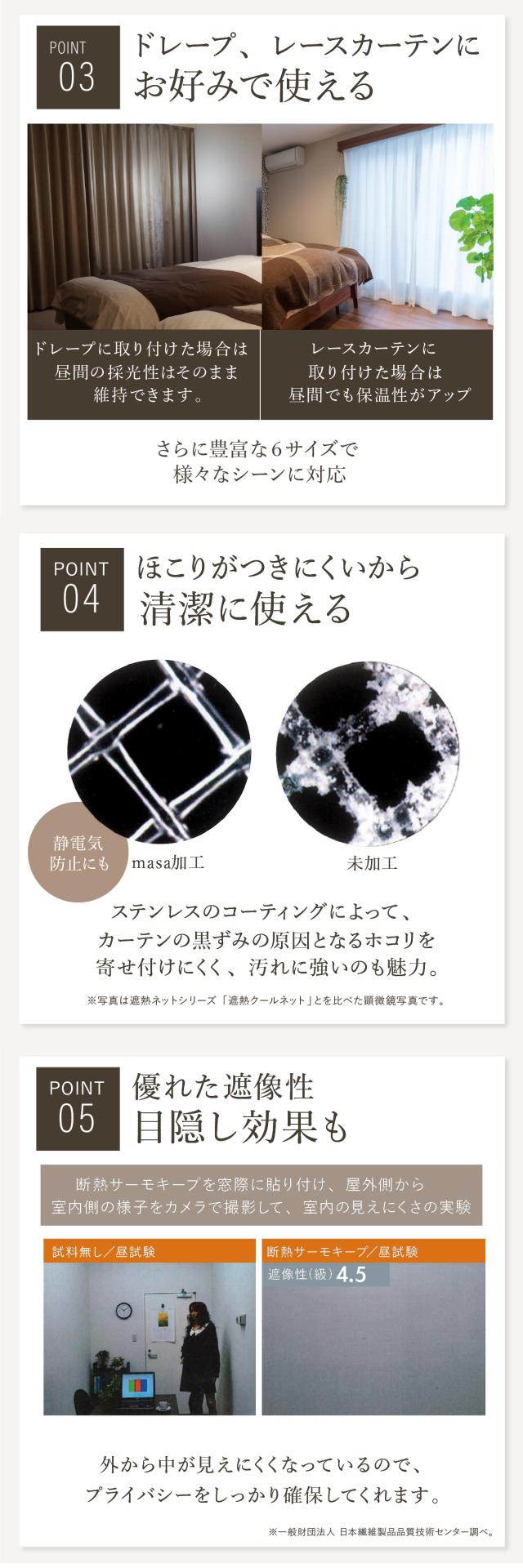 夏場は外からの太陽熱をはね返すコーティング面を、本品では部屋側に向けているため、熱が逃げにくくなります。