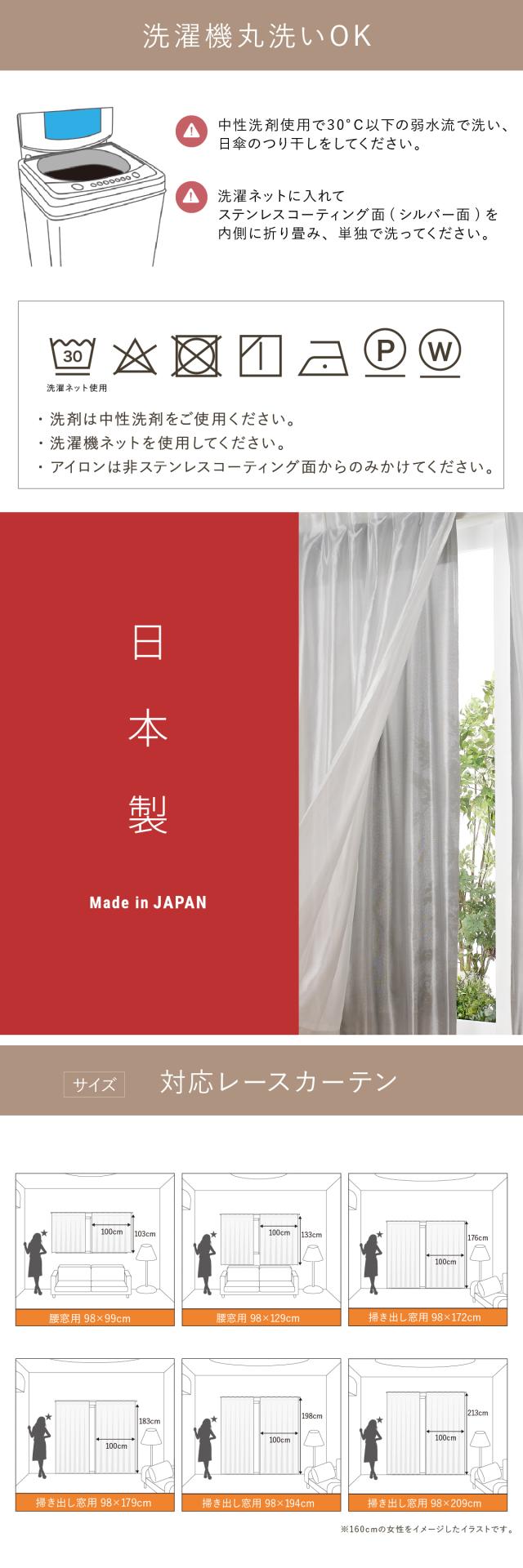・2枚組で、1枚の幅は98cm。100cm幅の窓に対応しています。丈はご自宅の窓サイズに合わせ6種類。予め窓のサイズを測ってからお求めください。