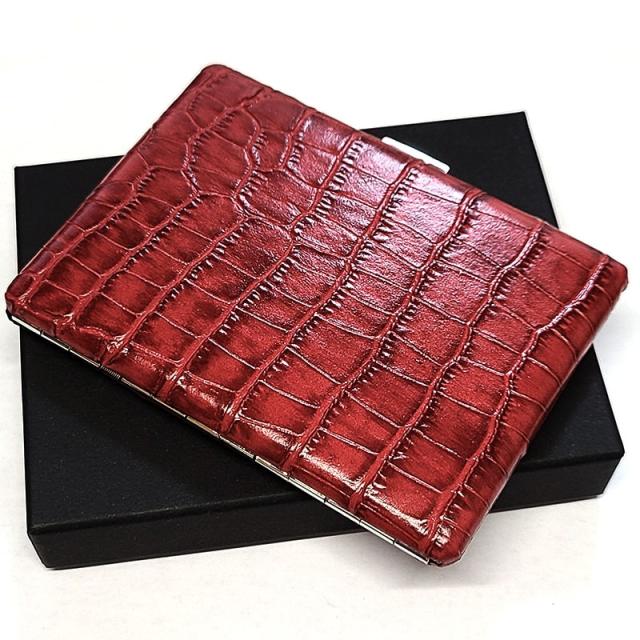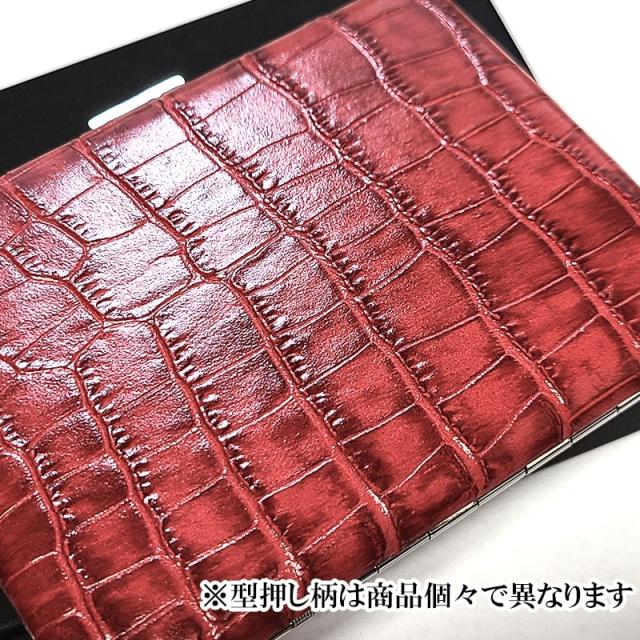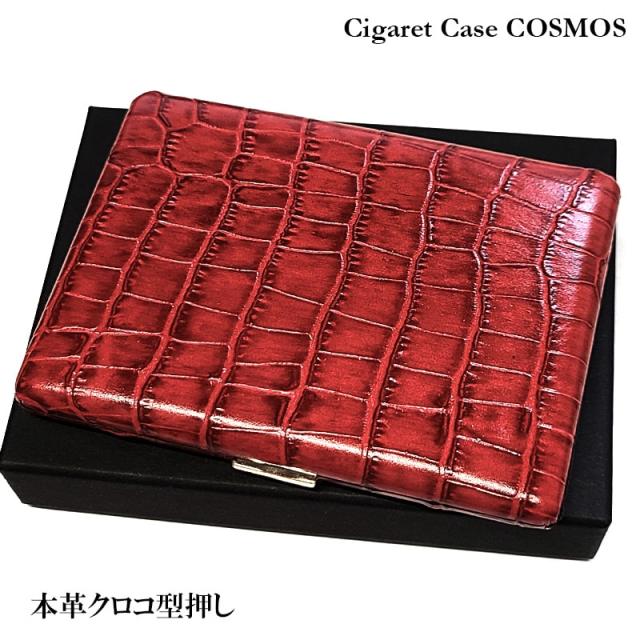 シガレットケース レザー おしゃれ クロコ型押し 本革 コスモス レッド 100mm/70mm対応 ロング 薄型 日本製 坪田パール 真鍮 革貼り タバコケース 赤 レディース メンズ ギフト プレゼント