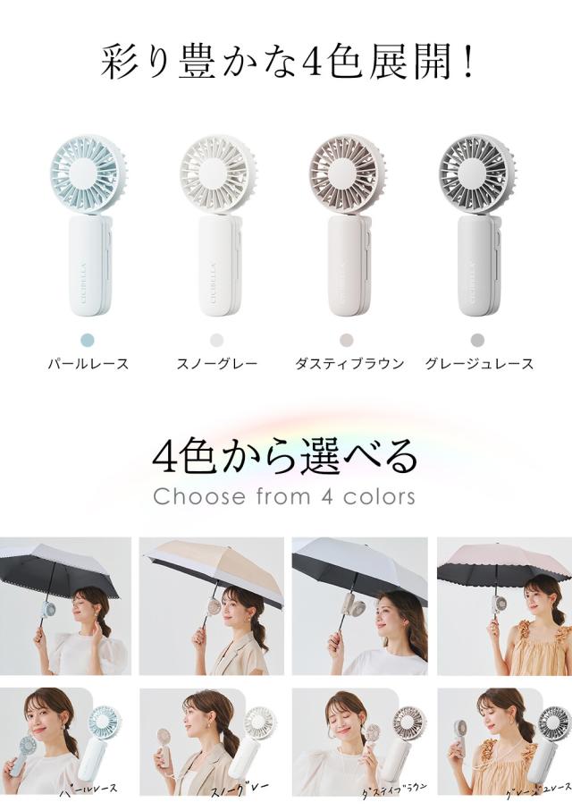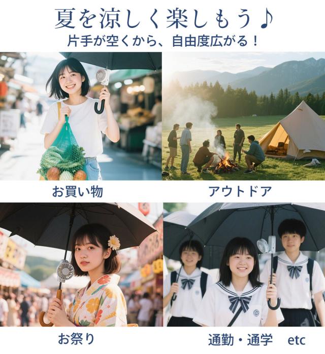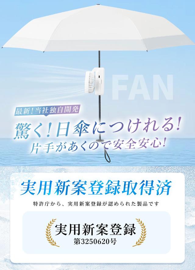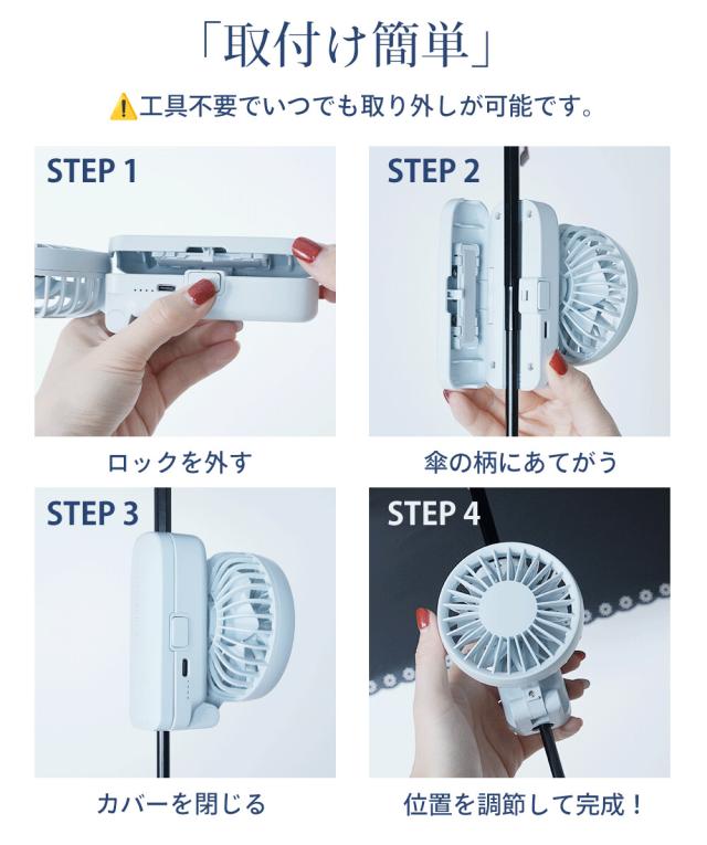 日傘に装着するので、手に持つ必要がなく角度調整が可能なので風向きを調整し快適性UP!