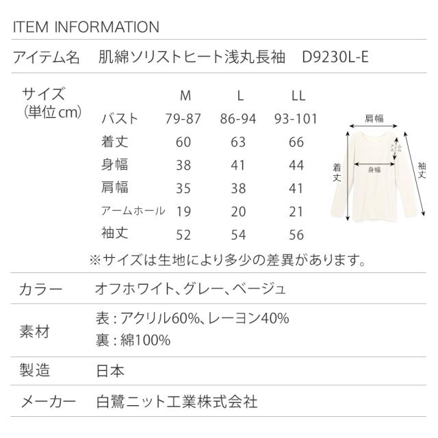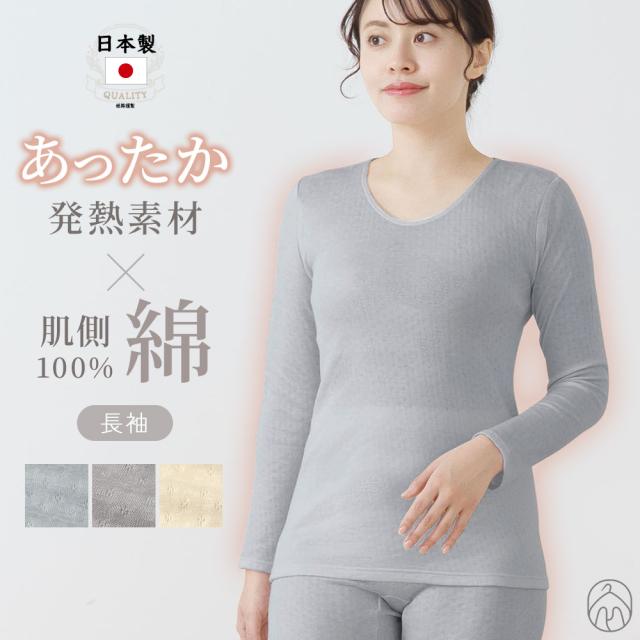 肌綿 ソリストヒート 長袖インナー 日本製 発熱 シャツ レディース 秋冬 吸湿 防寒 暖かい あたたかい 保温 肌側綿100% 縫い目なし 丸編み 薄手 肌綿 浅丸 軽い レース 冬用 女性 婦人 下着 肌着 D9230L-E