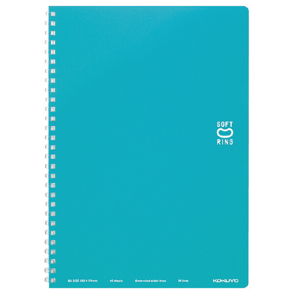 "●コクヨ独自開発の“新感覚やわらかリング”を採用したリングノートです。●平らに開くので書き込みやすい、平らに折り返せるので狭い場所でも心地よく使える、といったリングノートのよさはそのままに、書くときリングに手が当たっても気にせず端まで美しく書ける、これからの新定番ノートです。●リング形状が“Dの字型”になっているので、リング幅がコンパクトでリングノート特有のかさばり感がありません。●「美しく書く」をサポートするドット入り罫線を採用しました●中紙/上質紙●表紙/表:PP表紙、裏:板紙◆表紙色B・・・ブルー、D・・・ブラック、LB・・・ライトブルー、LG・・・ライトグリーン、P・・・ピンク、YR・・・オレンジ●サイズ:6号(セミB5)●中紙寸法(タテ・ヨコ):252・179●罫内容:中横罫(ドット入り)●行数:36行●枚数:40枚"