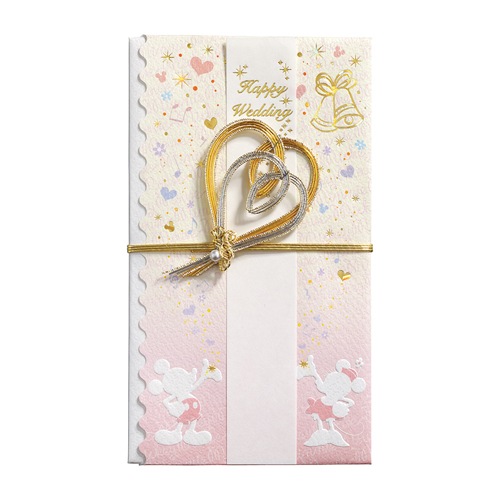 人気のディズニーキャラクターが婚礼用金封なりました。宝石のように輝くホログラム箔、立体感がある浮き出し加工、光を受けて無数にきらめく水引飾り、それぞれの輝きがディズニーの世界を表現したスペシャルな金封です。ミッキーとミニーが幸せのおまじないをかけているような可愛いデザインとハートの水引飾りが目を惹く、ハ ッピーでキュートなエッセンスがたっぷりな金封です。 110×185×10mm 32g
