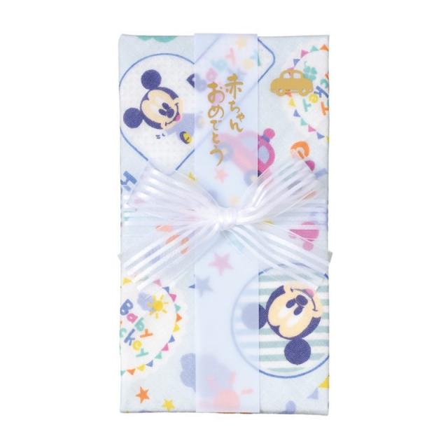 可愛らしいディズニーキャラクターのガーゼハンカチを使用した、出産お祝いのための金封です。コロンとしたベビーミッキーと乗り物のアートがちりばめられた華やかでポップなデザインがキュート。お祝いとして差し上げた後は、捨てずにハンカチとしてご使用いただけます。ガーゼハンカチは品質の高い日本製です。サイズ:(金封)100×180mm、(ガーゼハンカチ)約280×280mm。ガーゼハンカチ素材:綿100%。「赤ちゃんおめでとう」、「お祝」の短冊2枚入。中袋付。1枚入。 115×183×9