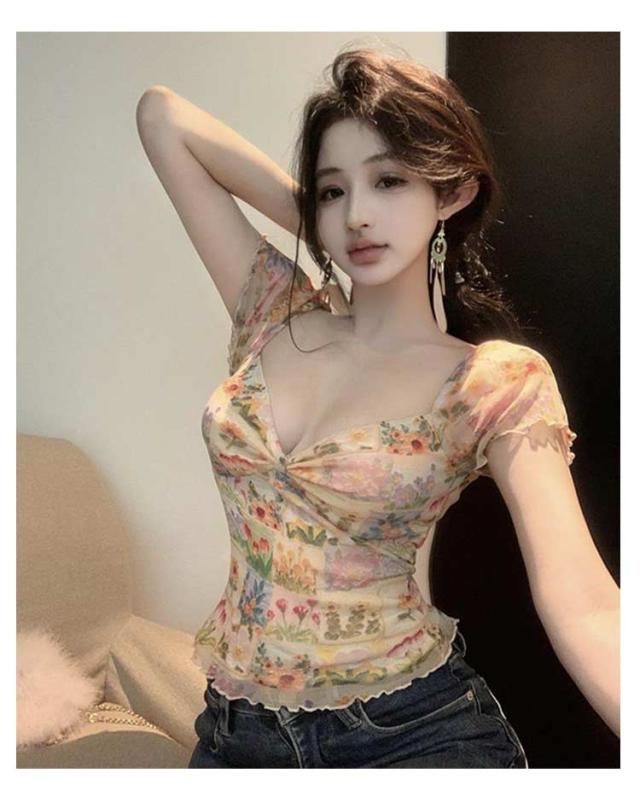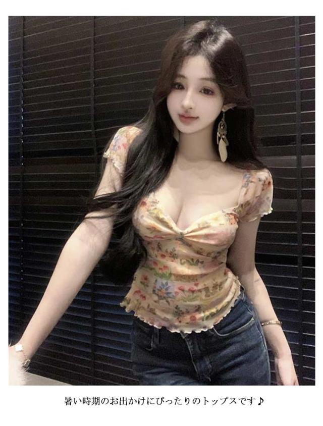 深め 薄手 夏 Tシャツ トップス Vネック 半袖 カットソー タイト トップス 美シルエット 花柄 レディース セクシー シンプル きれいめ おしゃれ リムフィット 大人 女性用 フェミニン 20代 30代