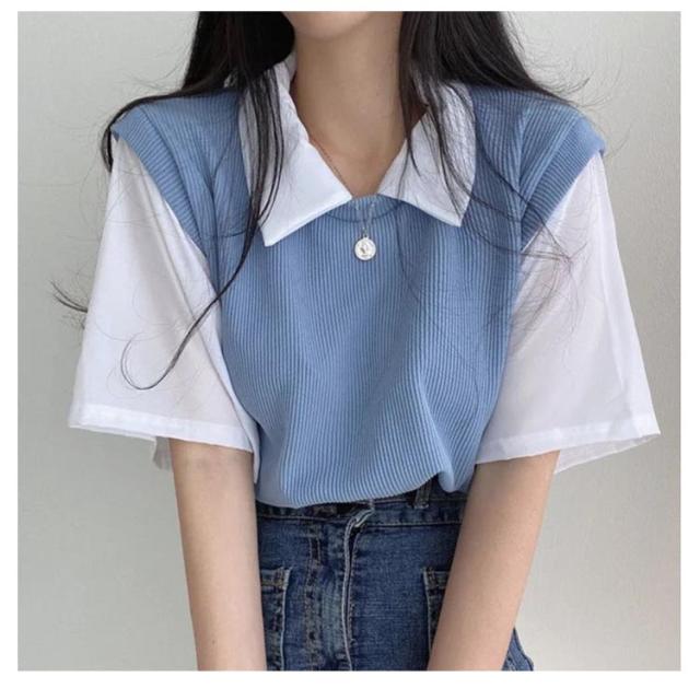 重ね着風 半袖 夏 tシャツ 襟付き レディース フェイクツーピース 半袖トップス 半袖トップス プルオーバー 学生 スクール ゆったり 普段使い シンプル カジュアル 着回し リラックス 春夏 通学 ブルー ブラック ベージュ