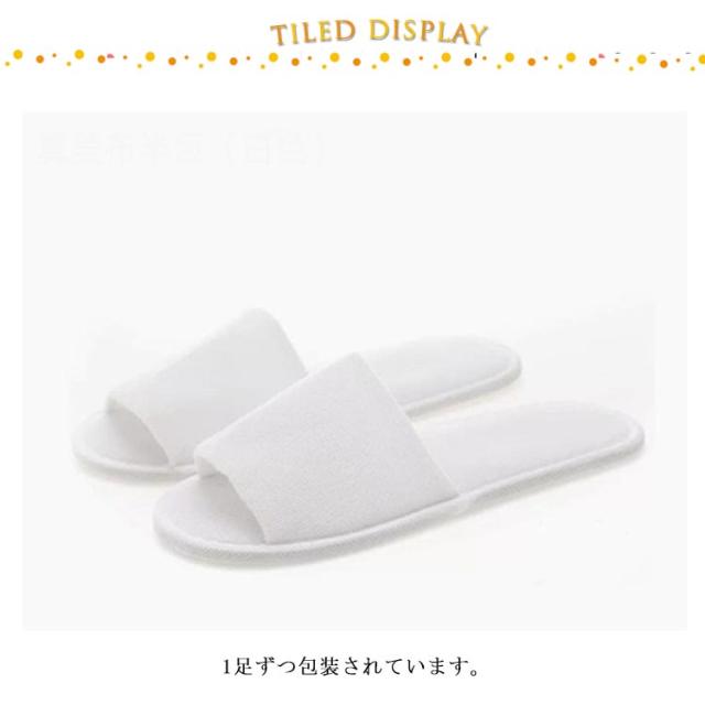 | ムレにくい前開きタイプ、パイル地の使い捨てスリッパです。【100足】【前開き?前詰まり】2タイプ 1足ずつ包装されています。 来客用、ホテル室内、クリニック、美容サロン、マッサージ店等に最適です。 衛生的で安心な個包装・使い捨てタイプです。 | |
