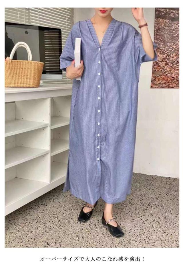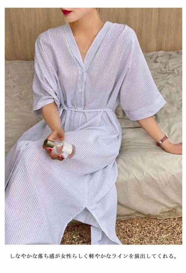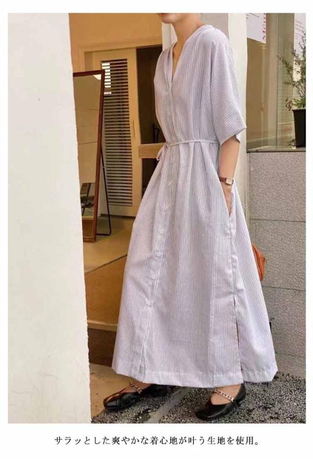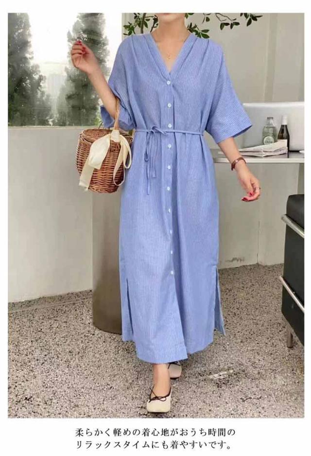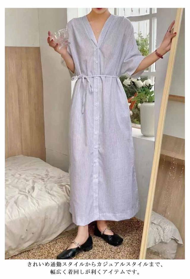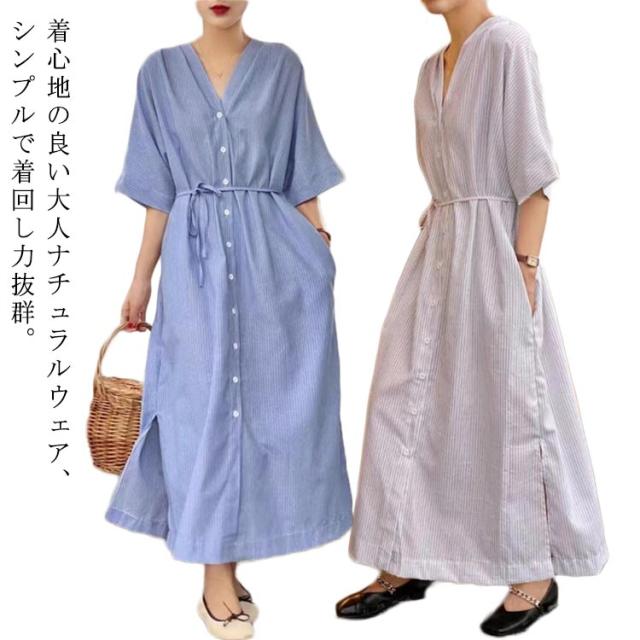 ロング丈 シャツワンピース ストライプ柄 マキシワンピース Vネック ポケット付き ロングシャツ シャツワンピース ロングワンピース 半袖 ウェスト紐付き カジュアル きれいめ ナチュラル