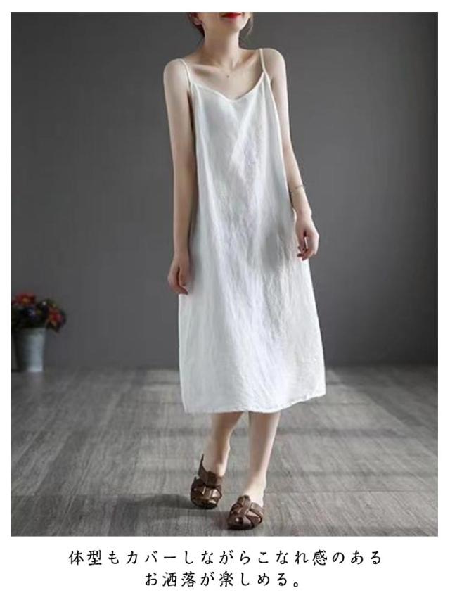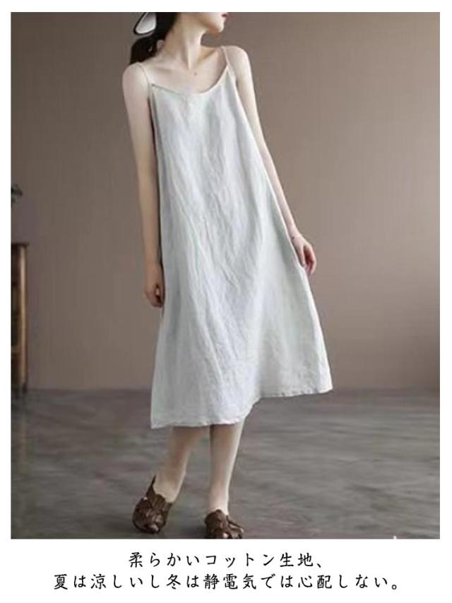 ノースリーブ レディース ミモレ丈 キャミ キャミソール 体型カバー 夏 Aライン ワンピース キャミワンピ ロングワンピ ゆったり 綿混 キャミワンピース 無地 薄手 袖なしワンピース Aラインワンピース ホワイト