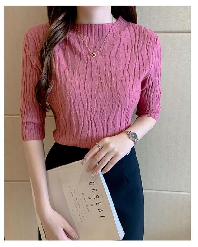 トップス ニット 七分丈 レディース 5分袖 袖長め ハーフタートルネック オフィス リブニット きれいめ 大人 可愛い 体型カバー カジュアル ナチュラル きれいめ 春 秋