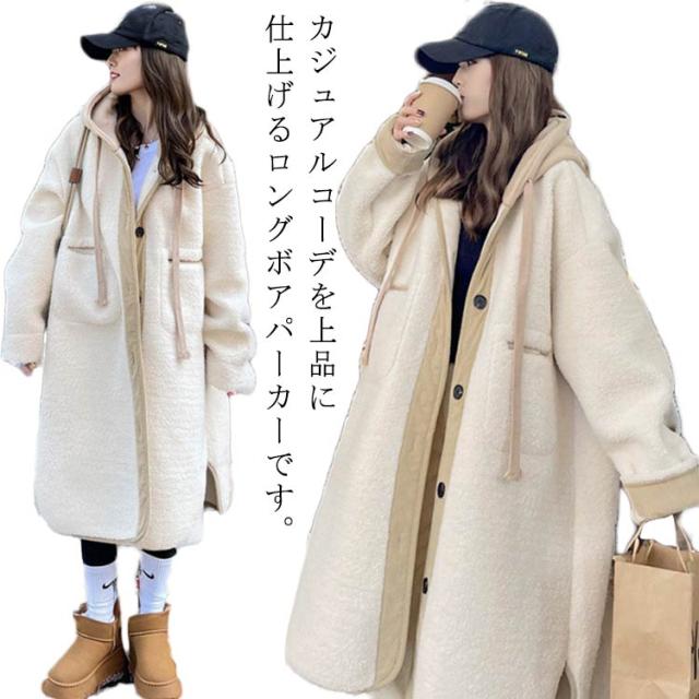 ボアコート ロング フード付き ボアコート ボアジャケット ボアブルゾン 切り替え トップス エコファー 冬 長袖 暖かい アウター 秋 異素材 カジュアル きれいめ 体型カバー