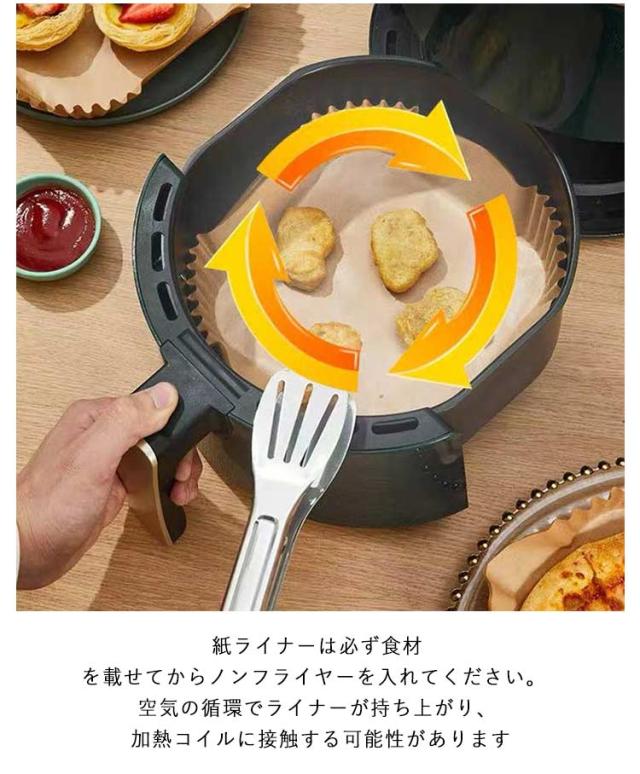 | エアフライヤー用クッキングシート100枚入りです。 食品グレードの高級パーチメント紙を使用し、防水性、耐油性、耐熱性に優れています。肉を入れてもぼろぼろになったり、肉汁や調味料が漏れたりしません。220℃までの高温に適用しています。 紙ライナーは必ず食材を載せてからノンフライヤーを入れてください。 空気の循環でライナーが持ち上がり、加熱コイルに接触する可能性があります。 ノンフライヤーを予熱している間は紙ライナーを使用しないでください。 直火または炭火グリルの上で直接紙ライナを使用しないでください。 紙ライナーは食材に影響する可能性があります。実際の状況に合わせて温度と時間を調整してください。 エアフライヤー以外でも蒸し器、オーブンでもつかえます。このまま生地を流し込んで蒸しパン、オーブンでのパン焼きに使えます。また、電子レンジで、冷凍ものや揚げ物の温め直しに便利です。 エアフライヤー調理用紙は、敷いて終わったら捨てるだけで、ノンフライヤーのバスケットを汚さずに調理できます。調理後、毎回洗う手間が省けて、水も洗剤も節約できます。 | |