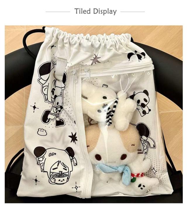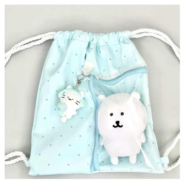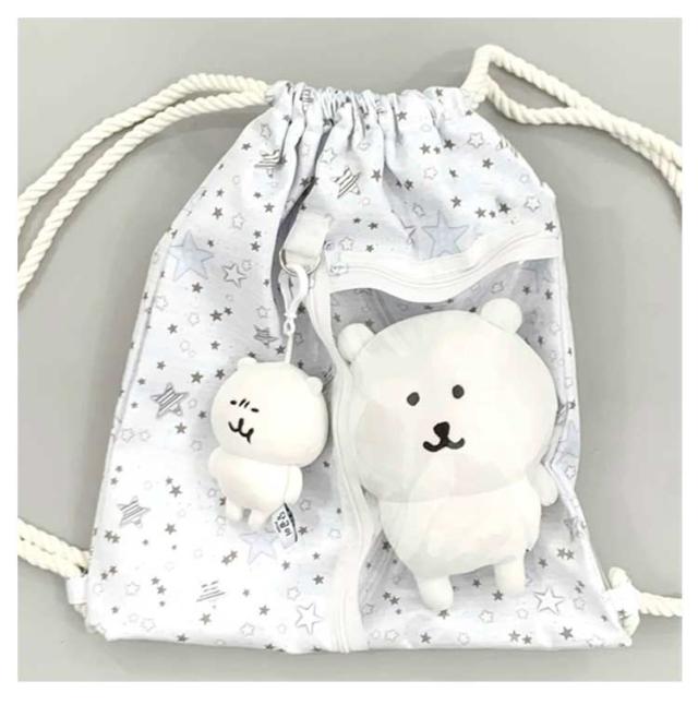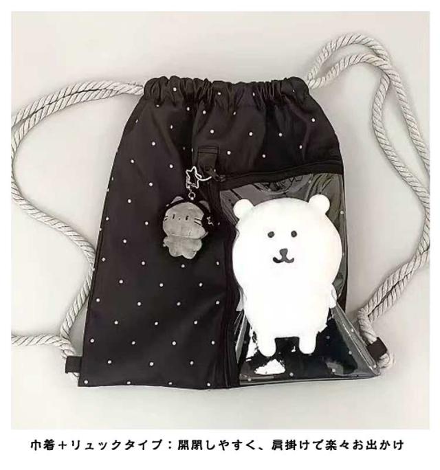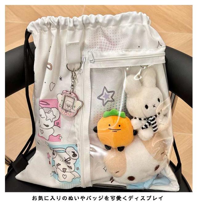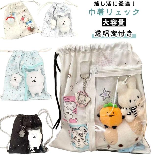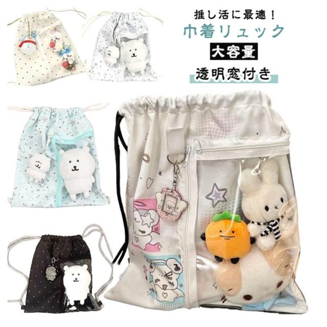| 推し活に最適!巾着リュック お気に入りのぬいやバッジを可愛くディスプレイ 推し活・通学・イベントに大活躍! 透明ウィンドウ付き:ぬいぐるみ・缶バッジなどを可愛く見せる痛バッグ風デザイン 巾着+リュックタイプ:開閉しやすく、肩掛けで楽々お出かけ | |