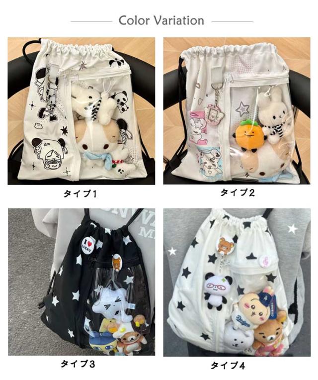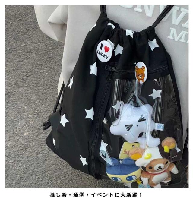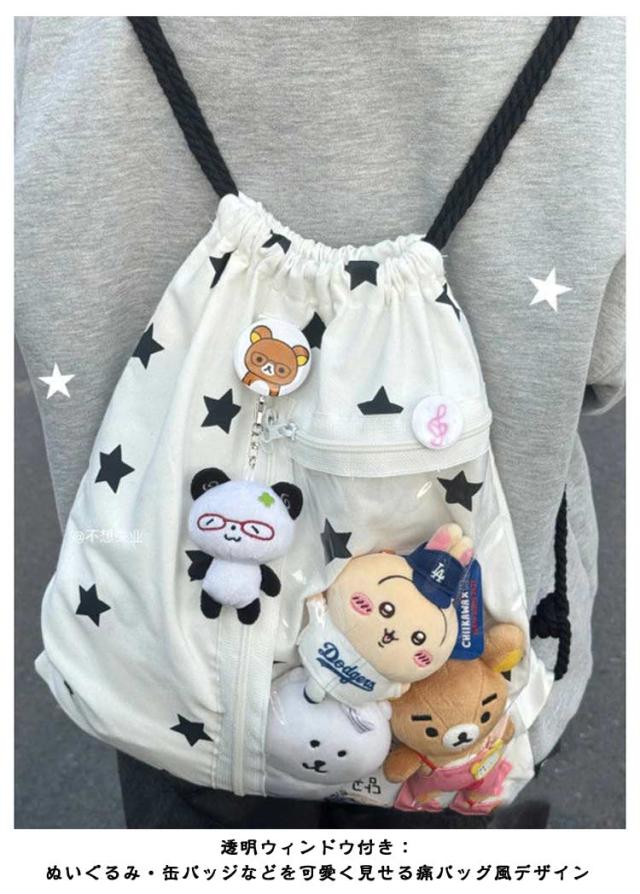 ナップサック 缶バッチ ぬい収納 透明窓付き 痛バッグ レディース リュック リュックサック 大容量 巾着バッグ スター柄 ドット柄 ストライプ柄 おしゃれ 可愛い 女子高生 大人 プレゼント