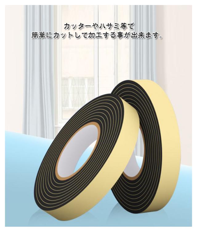 | 耐衝撃性に優れたEVA素材の隙間テープです。 ドアや引き戸、窓のすきま風防止や騒音対策に 裏面の粘着テープで取り付けも簡単! カッターやハサミ等で簡単にカットして加工する事が出来ます。 | |