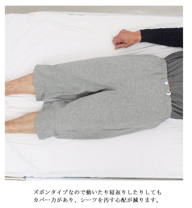 | 介護用おねしょズボン。【7分丈】【S-3XL】 腰回りは柔らかく伸びの良い総ゴム設計。 吸湿性と通気性を兼ね備えた肌に優しい柔らかな綿100%。 ズボンタイプなので動いたり寝返りしたりしてもカバー力があり、シーツを汚す心配が減ります。 漏れを心配せず、安心して眠っていただけます。 | |