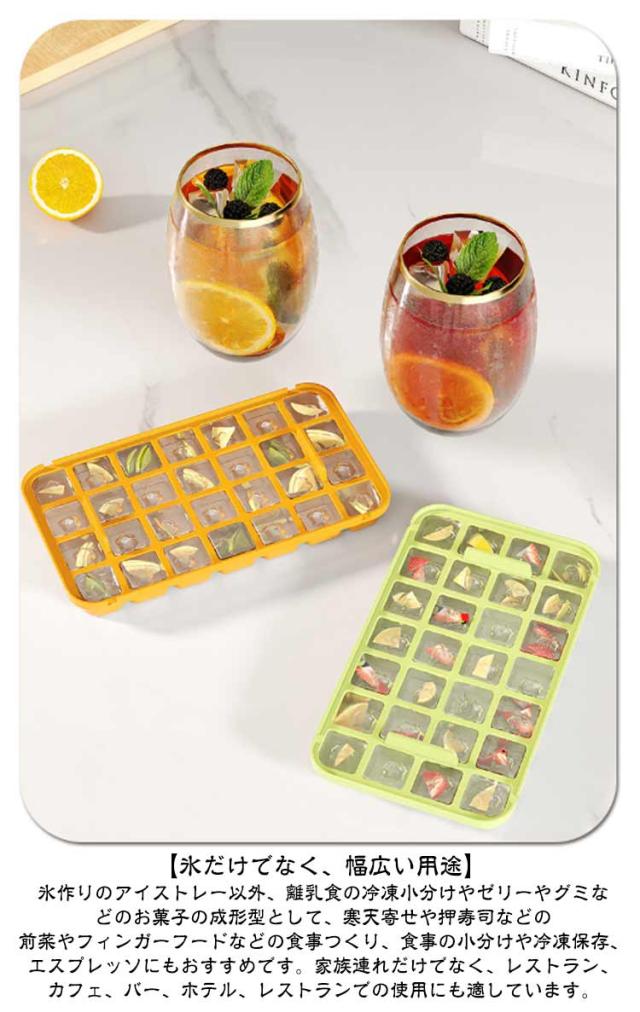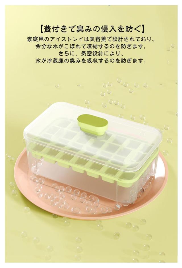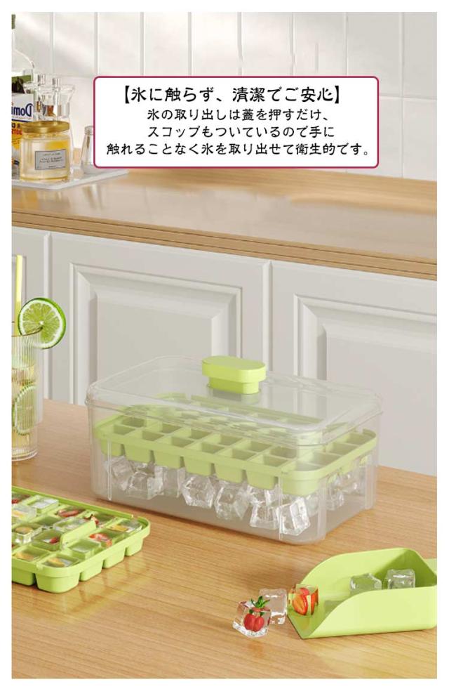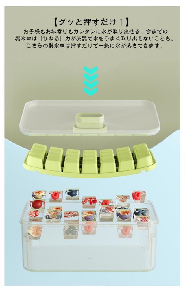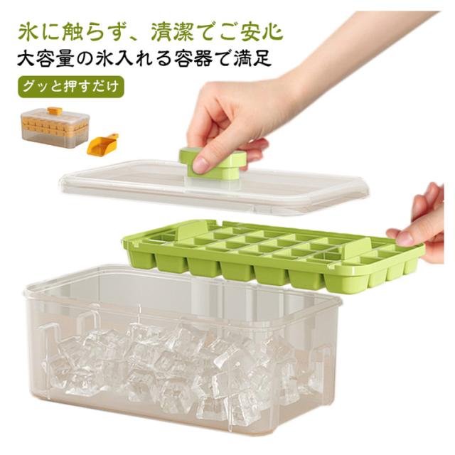 | 【グッと押すだけ!】お子様もお年寄りもカンタンに氷が取り出せる!今までの製氷皿は「ひねる」力が必要で氷をうまく取り出せないことも。こちらの製氷皿は押すだけで一気に氷が落ちてきます。 【氷に触らず、清潔でご安心】氷の取り出しは蓋を押すだけ、スコップもついているので手に触れることなく氷を取り出せて衛生的です。 【大容量の氷入れる容器で満足】氷56個ぐらいが入れる大容量の氷入れる容器付きなので、多めのアイスキューブを貯蔵してご使用いただけます。氷皿2枚で合計56個の氷を同時に作ることができます。冷たい飲み物を飲んで、涼しい夏を過ごしましょう。 【蓋付きで臭みの侵入を防ぐ】家庭用のアイストレイは気密蓋で設計されており、余分な水がこぼれて凍結するのを防ぎます。さらに、気密設計により、氷が冷蔵庫の臭みを吸収するのを防ぎます。 【氷だけでなく、幅広い用途】氷作りのアイストレー以外、離乳食の冷凍小分けやゼリーやグミなどのお菓子の成形型として、寒天寄せや押寿司などの前菜やフィンガーフードなどの食事つくり、食事の小分けや冷凍保存、エスプレッソにもおすすめです。家族連れだけでなく、レストラン、カフェ、バー、ホテル、レストランでの使用にも適しています。 | |