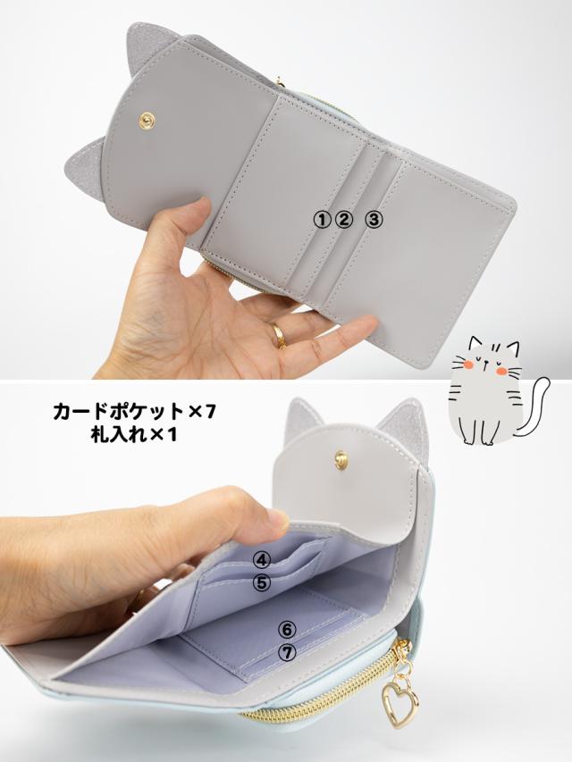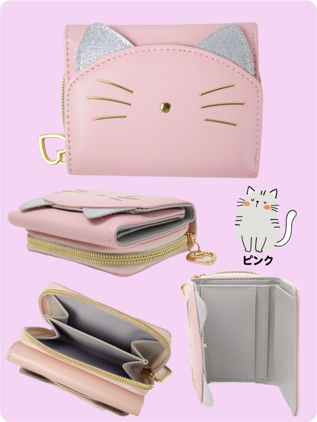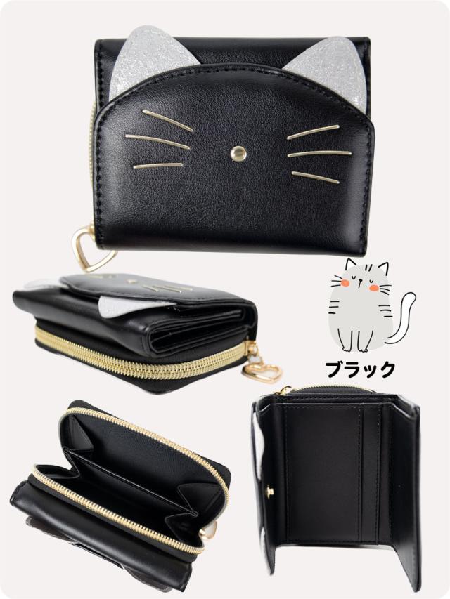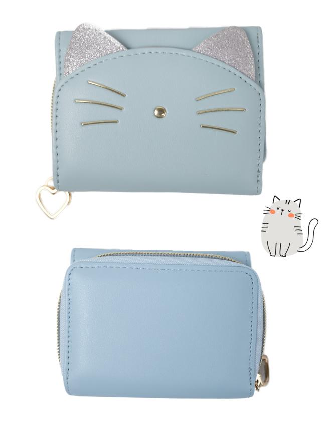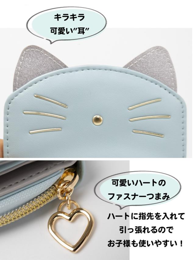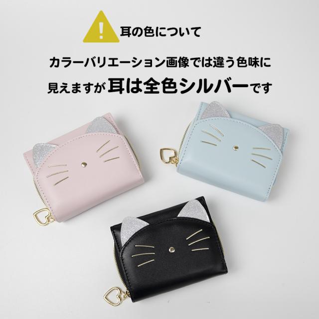 猫のかたちの愛らしい3つ折り財布です。キラキラシルバーの耳がポイント!お子様の手に収まりやすいコンパクトサイズのお札もカードも小銭も入るお財布です。ファスナーつまみはハートになっていて指先をひっかけて開閉することができます
