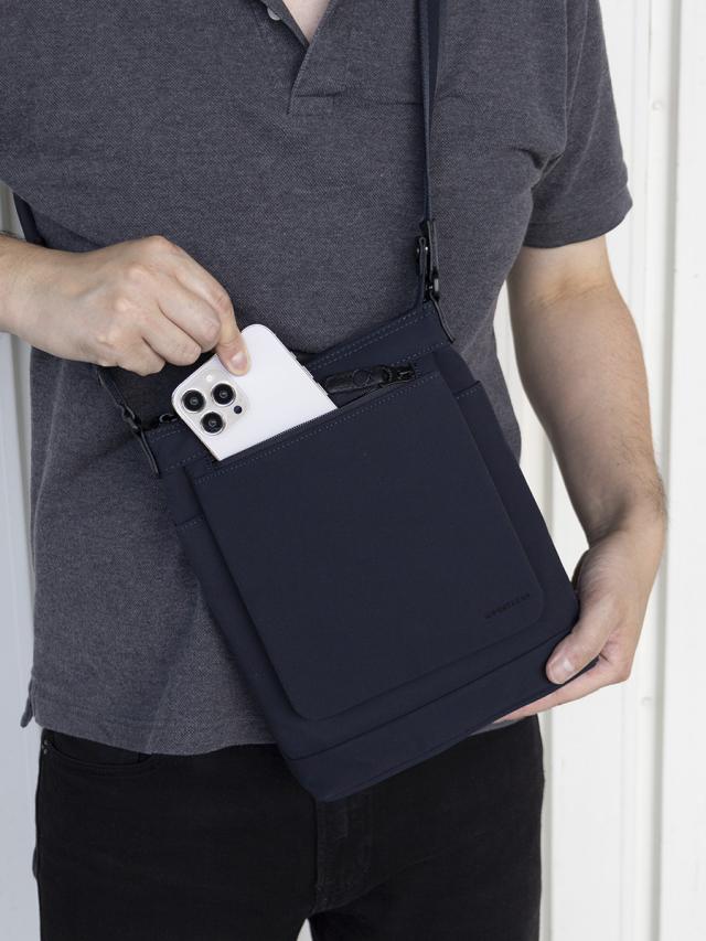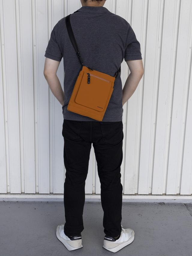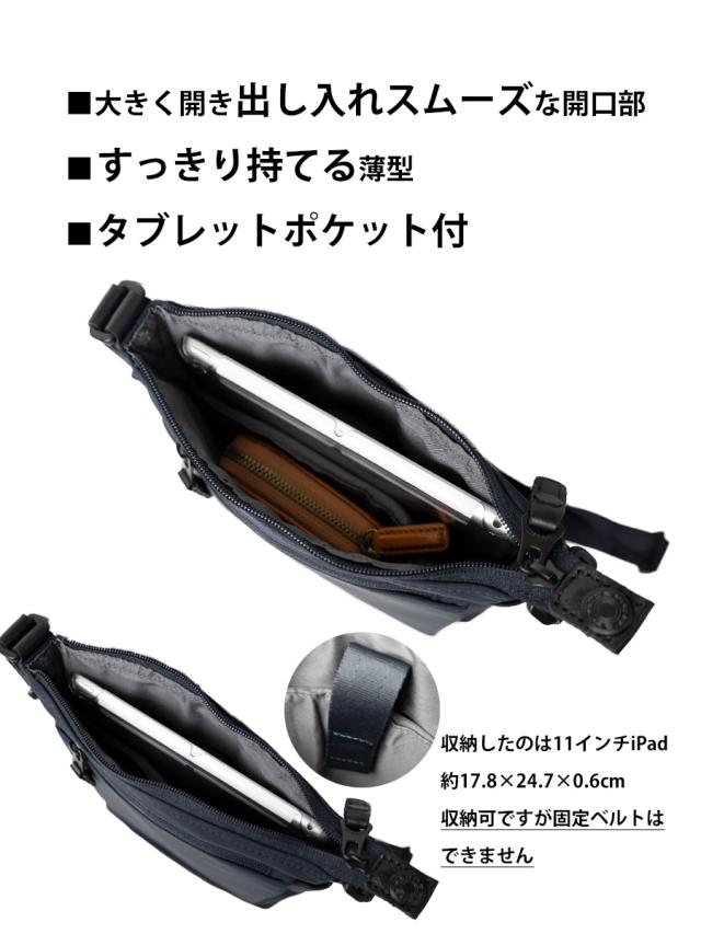タブレットポケット付きの薄マチタイプ。マチ幅は約4cmなのでタブレットとお財布程度の容量です。※iPadサイズは固定ベルトが届きませんが収納は可能です。スマホは3カ所の外ポケットのお好みの個所に収納ください。