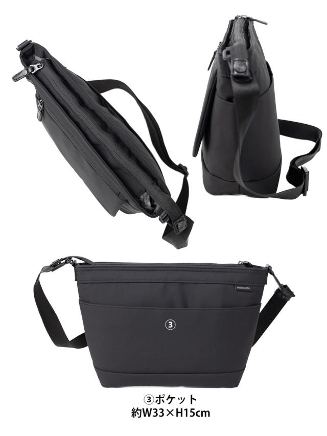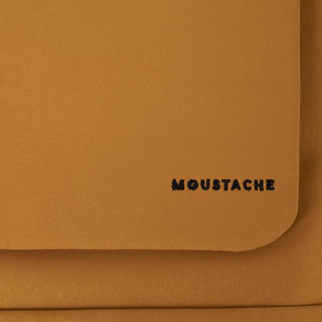 撥水加工を施したマットで光沢がない素材感の高密ポリエステルに黒のパーツを組み合わせたクールなショルダーバッグです。前面のポケット下にさりげなくMOUSTACHEの刺繍が入っています。