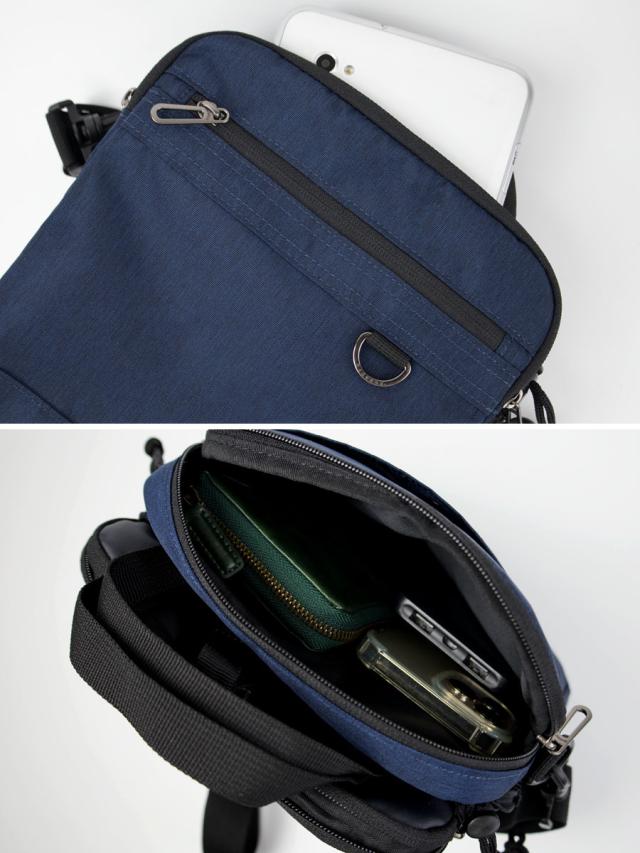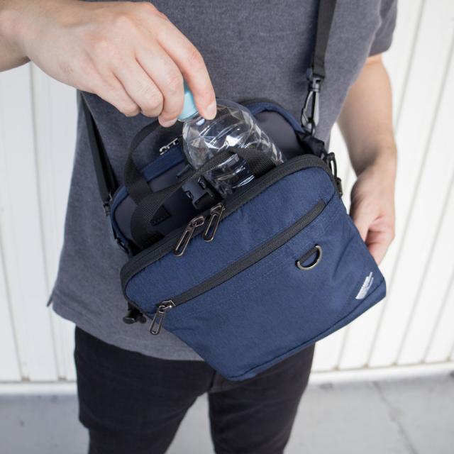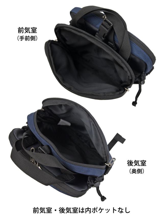メイン収納部は前後2室に分かれていて用途やアイテム別に収納が可能。中央のメッシュ部分はマチ幅調整が出来てポケットボトルが最大3本入るのでトラベルやフェスなど野外での活動にも便利です。
