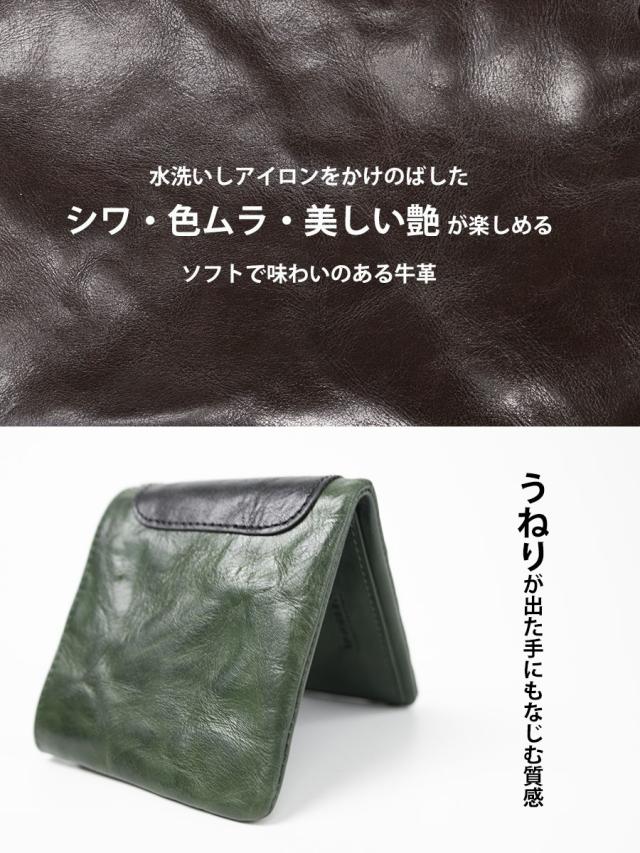 水洗いしアイロンをかけて伸ばした、シワ・色ムラ・美しい艶が楽しめるソフトで味わいのある牛革のお財布です。うねりが出た手にもなじむ革を袋縫いで仕上げることで革らしさを最大限に引き出しています。