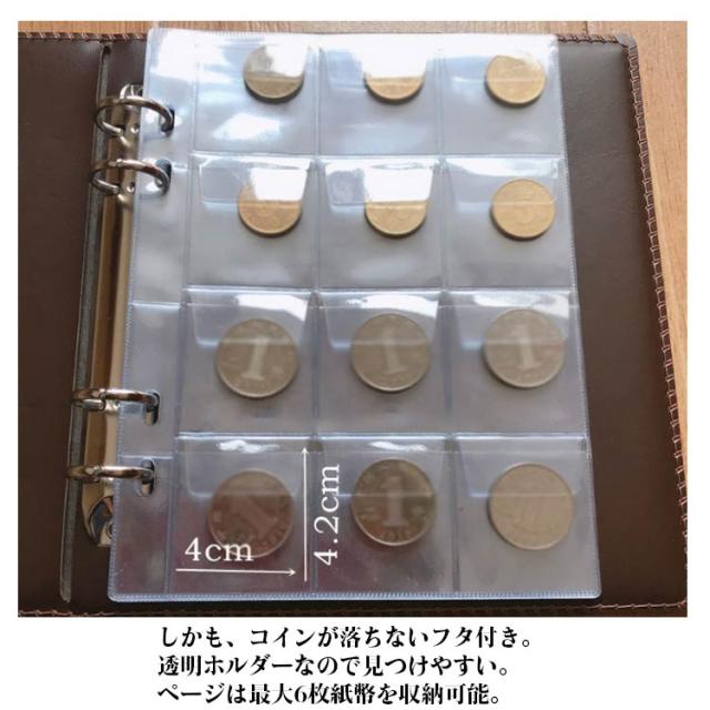 | たっぷり240枚収納できるコインアルバムです。 19.5cm×15.5cmのコンパクトなサイズで持ち運びに便利! 合計240枚のコイン収納が可能です。 しかも、コインが落ちないフタ付き。 透明ホルダーなので見つけやすい。ページは最大6枚紙幣を収納可能。 バインダー式のコレクションケースなので、ページの入れ替えや整理などを簡単に行う事ができて便利。 | |