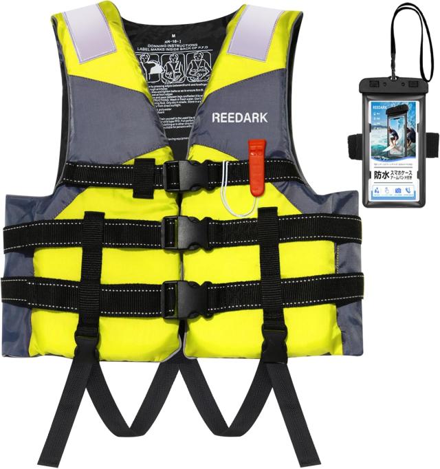 最大90kgの引張力に耐えるバックルは、衝撃に強く壊れにくい設計であり、水中で使用時に脱げる心配はありません。3つの調節可能なストラップは使用者の体型に合わせて確実なフィット感と安定性を提供し、股下ベルトは万が一落水時ライフジャケットが浮き上がるのを防ぎます。さらに、両肩の反射板は夜間でも目立つ素材で、右胸部のホイッスルは迷子になっても「ここにいます!」と用着者の位置をお知らせます。