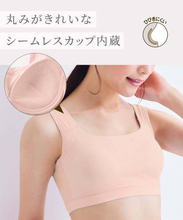 吸汗速乾メッシュ生地で汗をかいてもサラサラ!暑い季節も気持ちいいハーフトップ。 バストをしっかり包み、よく伸びて肌にフィット。 アンダーバストはゴムが肌にあたらないくるみ仕様。 バックパネル上辺はゴム入り折り返し仕様で背中のお肉もくいこみにくく、やさしい肌あたり。 シンプルカラーで使い勝手がいいのも 。 カップ部分にシームレスカップを使用しているためアウターに響きにくい