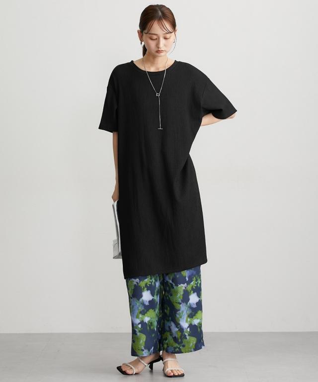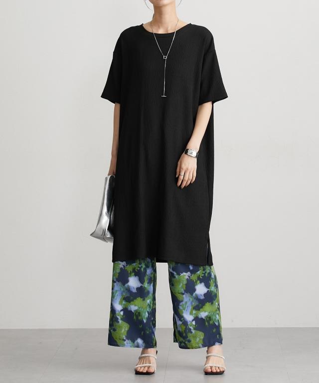 品質=ポリエステル95%・ポリウレタン5% 透け感: なし 伸縮性:あり 生地の厚み:普通 光沢感:ややあり 裏地:なし ポケット:なし 季節:夏 シルエット:ゆったり 原産国:中国製 備考:洗濯機OK ネット使用 ※単位:cm※商品サイズは、仕上がりサイズです。※サイズの誤差は多少発生します。ご了承ください。