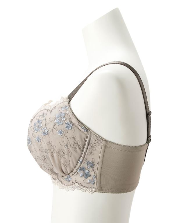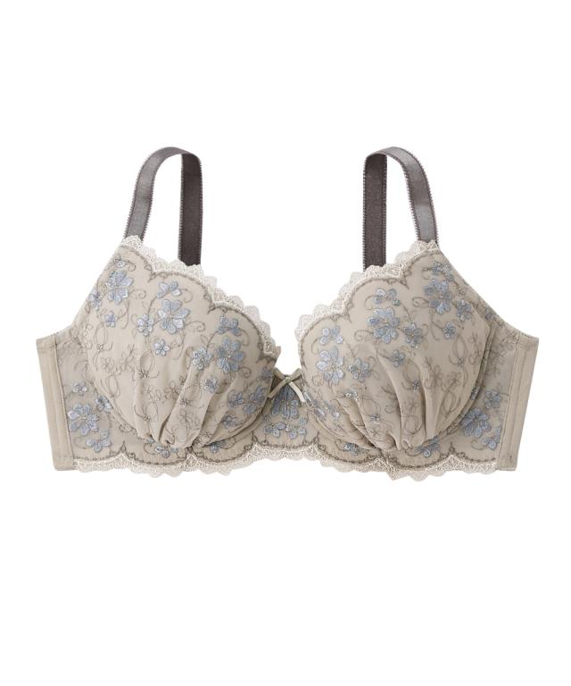 グラマーバストさんのためのデザインブラジャーシリーズ、高嶺のブラ。 かわいいも着け心地もあきらめたくない、そんなあなたのためのシリーズ。 愛らしい小花刺しゅうがバストを彩るブラジャー。 落ち着いた印象のグレーとおとなかわいいピンクの2色展開。 【ポイント】 ・刺しゅうがバストを華やかに魅せてくれます。 ・カップ裏のサイドパネルでバストの横流れを防止。 ・パッドポケット付き。お手持ちのパッドを入れてボリューム調整が可能。 ・バックU字スタイルで安定感のある着け心地。 ・ストラップ太めで肩の負担を軽減してくれます。