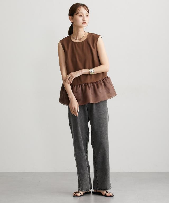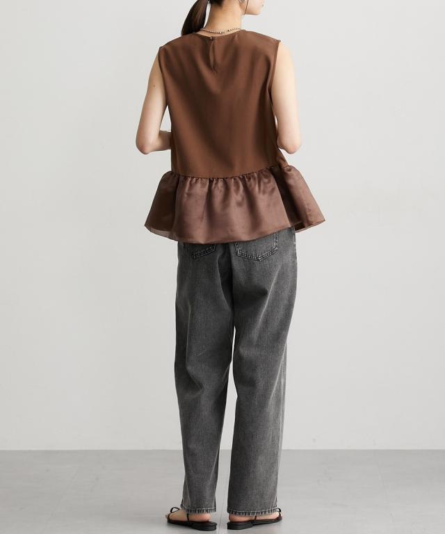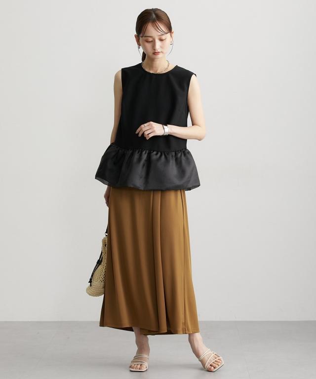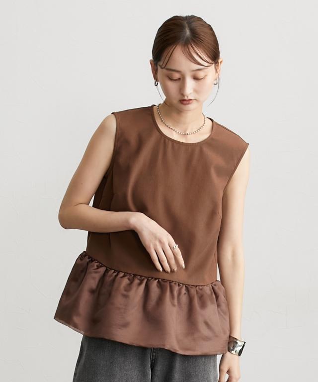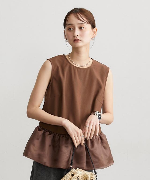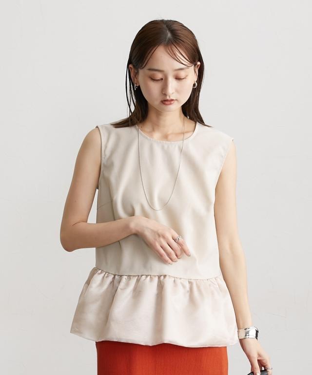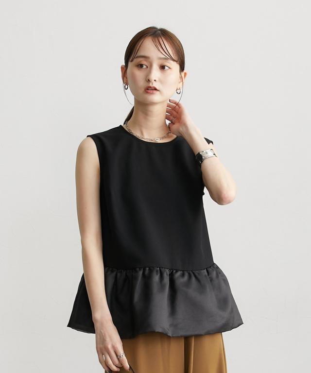 ■デザイン 薄手の麻調合繊素材に同色系のオーガンジー素材で切替えたペプラムブラウス。ノースリーブですっきり見えるアイテムです。張りのあるオーガンジー素材の切替でウエスト周りをさりげなくカバーしてくれるデザインです。 ■素材 本体はポリエステル100%の夏向けの薄手麻調合繊素材を使用。透けにくくほんのり麻調素材特有の光沢感もあるのでカジュアルすぎないアイテムです。 ■おすすめのスタイリング さらっとデニムに合わせても大人っぽいカジュアルコーデにしてくれるアイテム。きちんと見えるテーパードパンツやナロースカートなど合わせても通勤コーデにおすすめです。