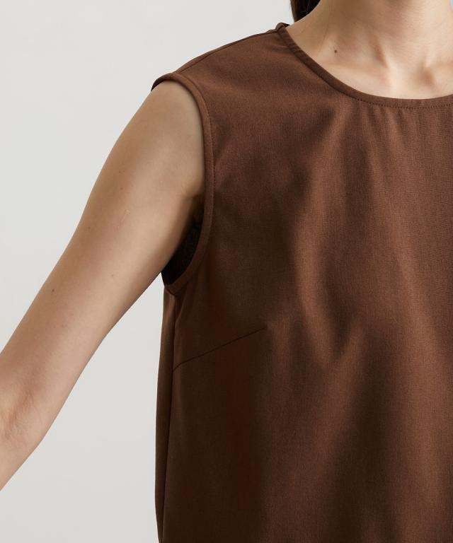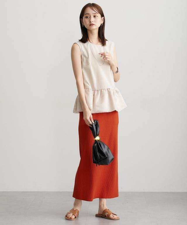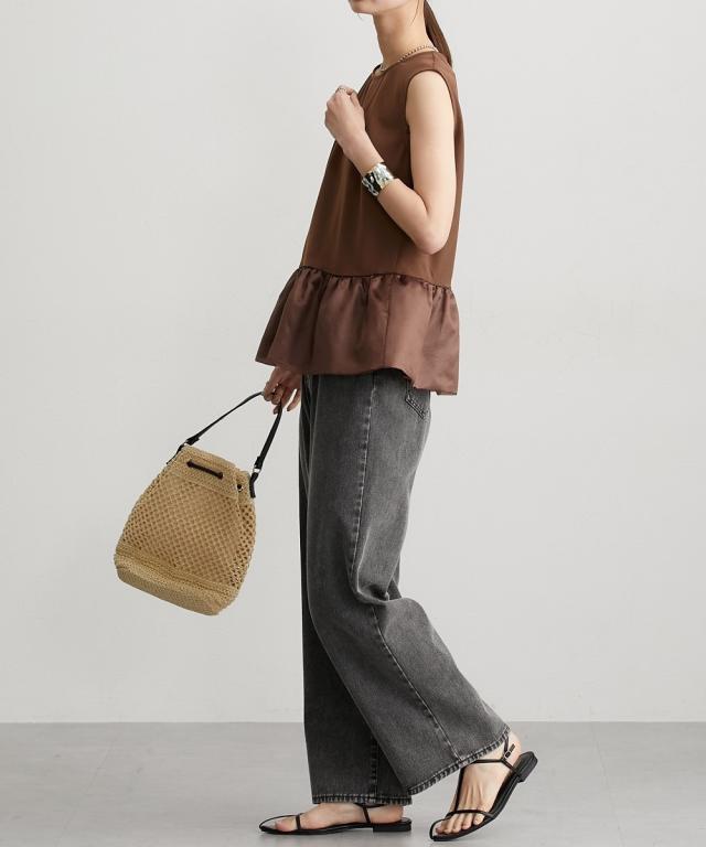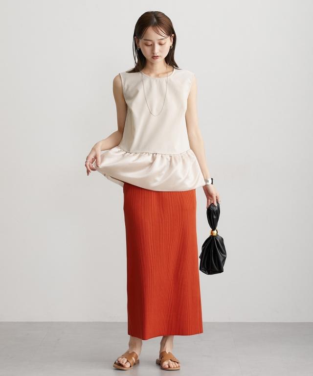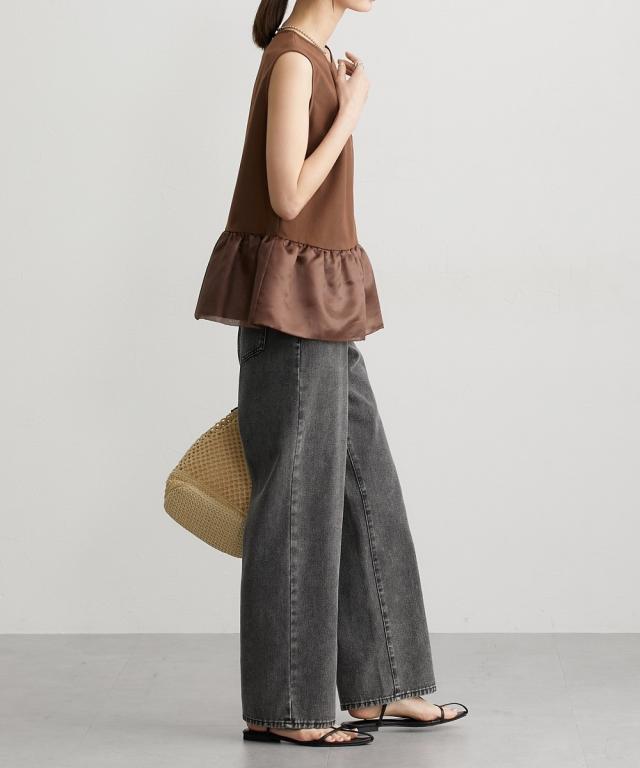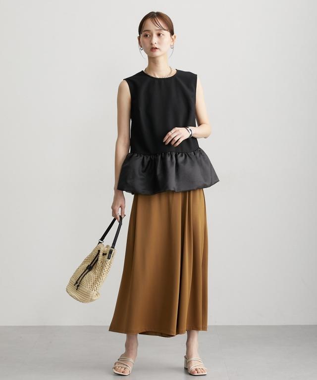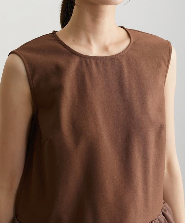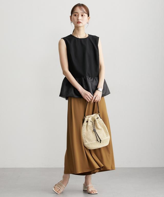 ■デザイン 薄手の麻調合繊素材に同色系のオーガンジー素材で切替えたペプラムブラウス。ノースリーブですっきり見えるアイテムです。張りのあるオーガンジー素材の切替でウエスト周りをさりげなくカバーしてくれるデザインです。 ■素材 本体はポリエステル100%の夏向けの薄手麻調合繊素材を使用。透けにくくほんのり麻調素材特有の光沢感もあるのでカジュアルすぎないアイテムです。 ■おすすめのスタイリング さらっとデニムに合わせても大人っぽいカジュアルコーデにしてくれるアイテム。きちんと見えるテーパードパンツやナロースカートなど合わせても通勤コーデにおすすめです。
