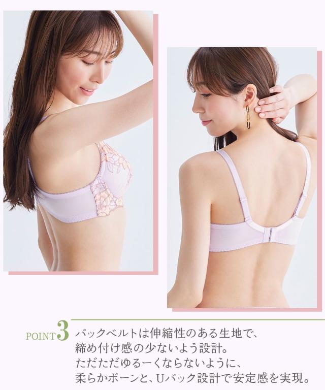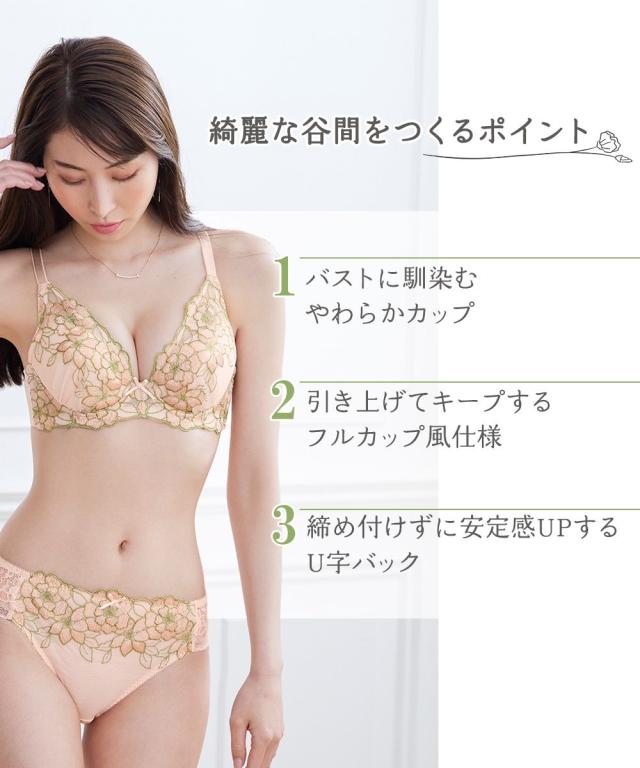 華やかなお花のレースをふんだんに使った、フルカップ風ブラジャーです。 3つのキレイな谷間を作るポイント 1:脇にバストを逃しにくい、すっぽり包むやわらか不織布カップ 2:集めたバストを引き上げてキープするフルカップ仕様 3:脇高だけど締め付けない伸縮性の高いバックベルト 4:作った谷間を安定させるUバック仕様 不自然に盛らずに、着用時のシルエットを整えるブラジャー。