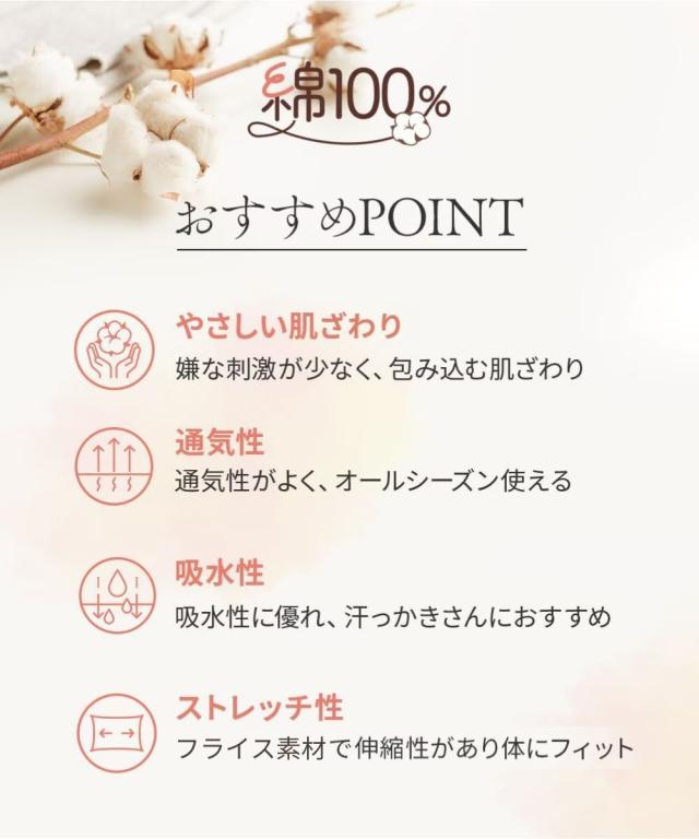 お肌に優しい綿100%フライスインナー 素肌に直接触れるインナーだからこそ、通気性良く肌ざわりのやさしい綿100%をおすすめします。 <天然素材100%> 天然素材コットン100%のインナーは、通気性や吸水性に優れており、さらりと快適な着心地が特徴です。 汗ばむ季節は、吸湿性により汗をすばやく吸収してさらりとした着心地を保ち、冬は保温性により暖かいため、一年を通して、快適に着用できます。 ふんわりとした優しい肌触りで下着の刺激やムレが気になる方にもおすすめです。<着心地のよい素材> フライス素材ならソフトに横伸びして快適な着心地。 心地よい柔らかさでソフトな風合いが魅力です。 ロング丈のキャミソール。かがんだり動いたりした際も背中が出にくく安心です。 <こんな方におすすめ> ○お肌に優しい素材 ○通年着られる ○セットでお得 ○豊富なサイズ展開 ※商品の色移りを防止するために個包装を行っている場合がございます。 個包装はプラスチック削減のため一部の色のみに使用しています。