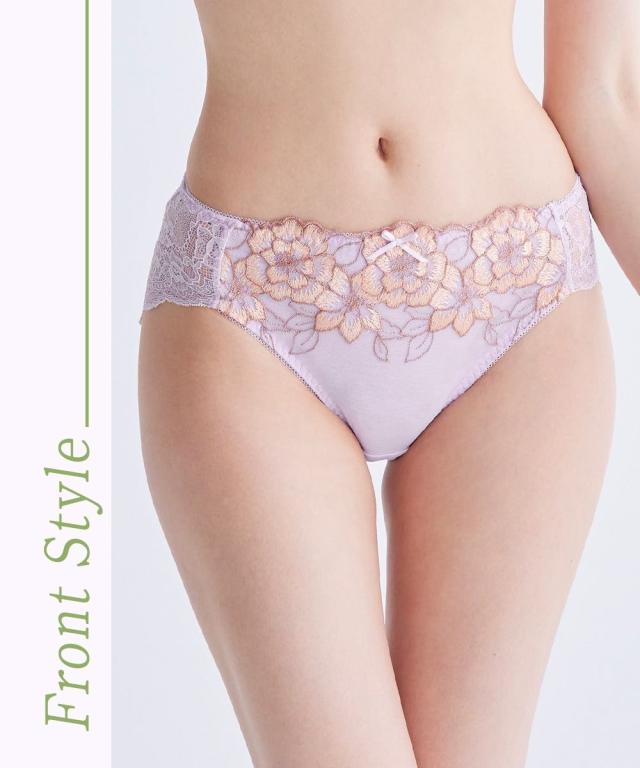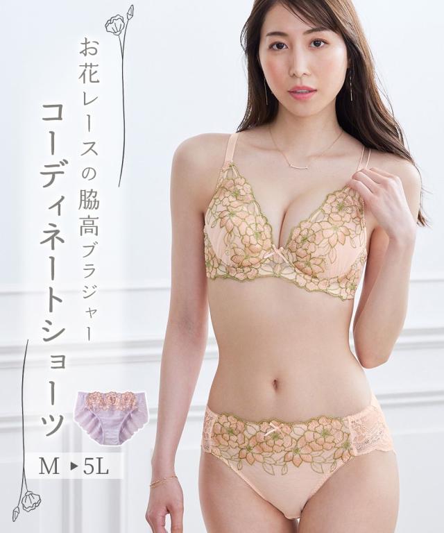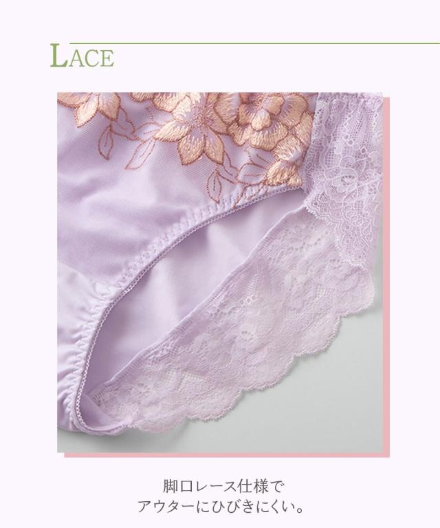 キレイな谷間をキープするフルカップ風ブラジャーのコーディネートショーツです。 華やかなお花たっぷりのレースを使用。 生地は2way方向に伸縮性の高く、体にフィットし、動きやすい。 脇丈は浅すぎず、深すぎず、バックはお尻をすっぽり包みます。 サイドはレースの透け感もあり、見た目もシルエットもすっきりキレイ。 脚口は締め付けを感じにくいレース使いで、食い込みにくいのでアウターにも響きにくい。