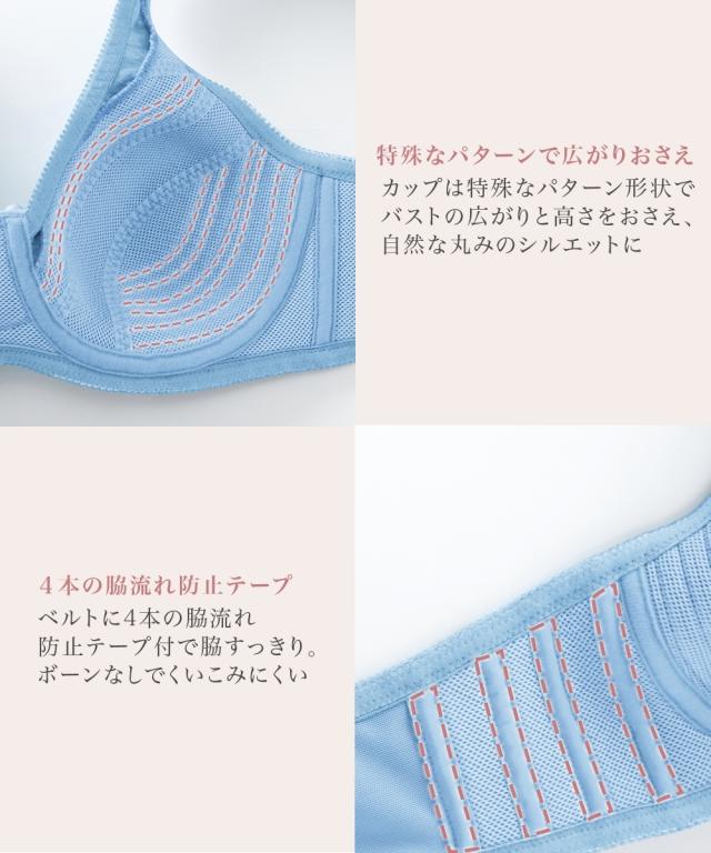 【おすすめポイント】 ・ワイヤーの圧迫感がない ・脇のボーンがない ・肩ひも太めで肩に食い込みにくい ・バストをすっぽり包むノンワイヤーフルカップ 【こんな方におすすめ】 ・ノンワイヤーだけと胸をしっかり持ち上げたい ・肩ひもの負担を軽減したいがストラップ調節もしたい ・背中のお肉の段差を軽減したい 【商品特徴・機能】 ・カップ部上辺はゴム仕様でぴったりフィットするフルカップタイプでバストをしっかり包みます ・幅広の肩ひもの裏側は一部クッション付でくいこみにくく肩がラク ・肩裏、脇部分、カップ裏、土台の肌側は吸汗速乾のダブルラッセルを使用し通気性が良い。 ・カップは縦接ぎ構造の切り替えでバストトップがとがりにくい丸いシルエット ・4本の伸び止めテープでボーン無しでもしっかりホールド ・バック部分は身生地二重仕立て、脇背中高設計でお肉段差をカバー ・フックアイは幅広70 使用で安定感がよい。