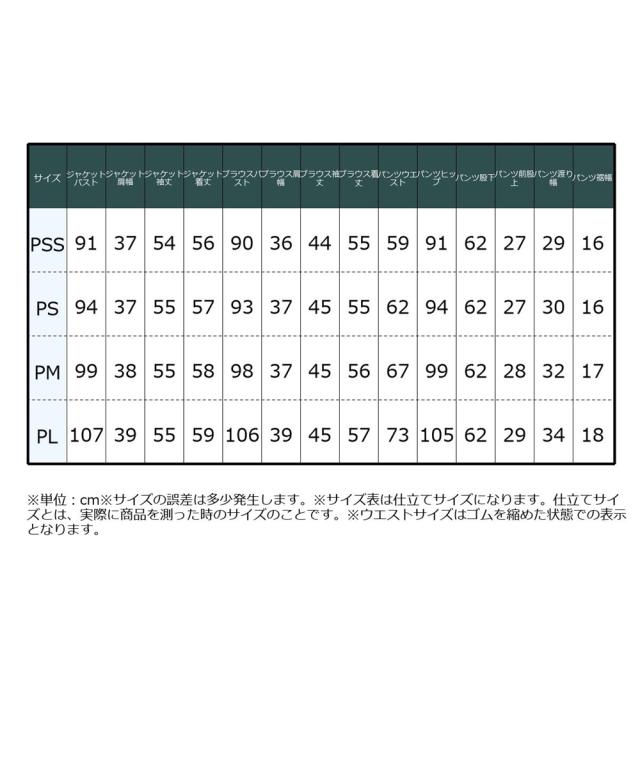 品質=【ジャケット】[表地]ポリエステル100% [裏地]ポリエステル100% 【ブラウス・パンツ】ポリエステル100%透け感:透けにくい 伸縮性:なし生地の厚み:普通光沢感:なし裏地:(ジャケット)あり※総裏 (ブラウス・パンツ)なしジャケット:肩パッドなし 袖口ベンツ開 両サイドポケット2つパンツ:前フック 前ファスナー 両サイドポケット2つ季節:春夏秋冬向きシルエット:普通※この商品はジャケット・ブラウス・パンツの3点同サイズのみで販売します。 原産国:中国製 備考:手洗い ※単位:cm※サイズの誤差は多少発生します。※サイズ表は仕立てサイズになります。仕立てサイズとは、実際に商品を測った時のサイズのことです。※ウエストサイズはゴムを縮めた状