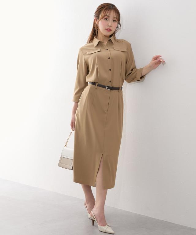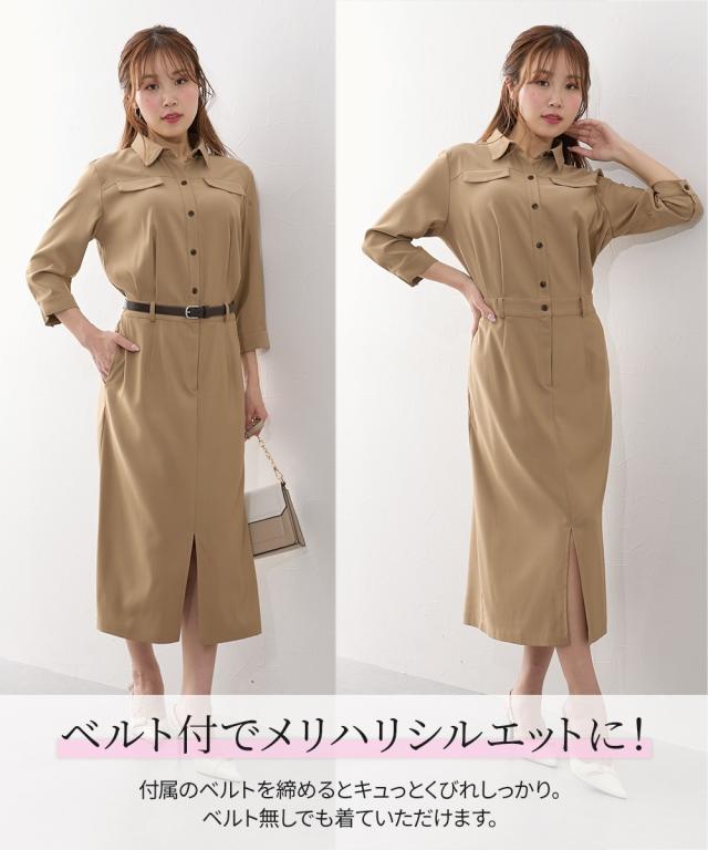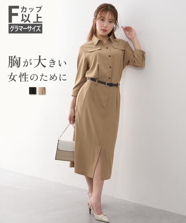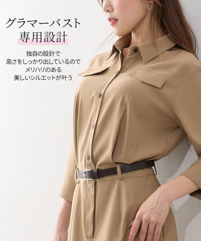 ワンピース ひざ丈 レディース 大きい胸専用 着やせを叶えるサファリ 七分袖 ベルト付 ポケット付 春 夏 秋 | 3L | ニッセン nissen
