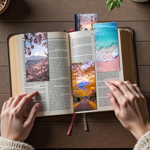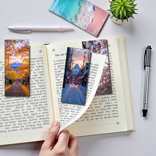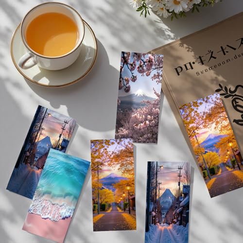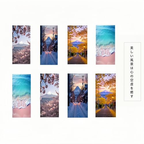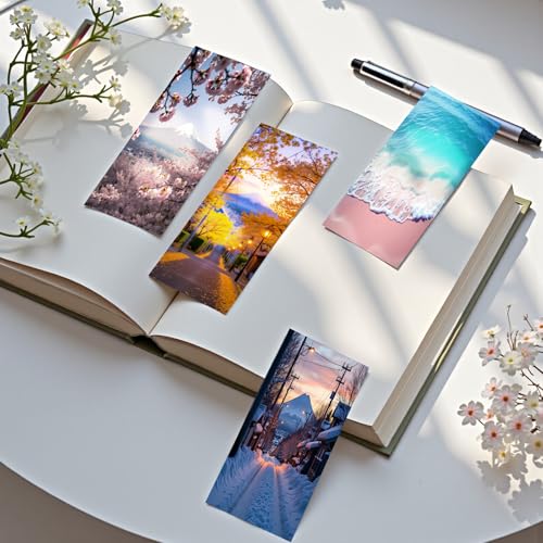 【スリムなデザインで収納も簡単】春(桜)、夏(海)、秋(紅葉)、冬(雪景色)の計4枚です。厚さわずか0.3mmの超薄型設計で、本やノートの間に挟んでも膨らまないので、収納時に圧迫感がありません,複数のブックマークを同時に使用する読者に適しています。