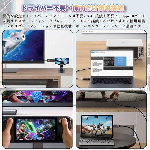 2.【ドライバー不要・挿すだけ簡単接続】面倒な設定やドライバーのインストールは不要。WiFi接続も不要で、Type-Cポートを備えたスマートフォン、タブレット、ノートPCに接続するだけですぐに使用可能。ビジネスプレゼンテーションや動画視聴、ホームエンターテイメントに最適です。
