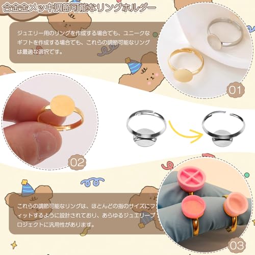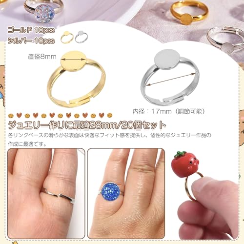 セット内容:調整可能な空のリングホルダー20個セット(ゴールド 10本+シルバー 10本);台座直径:8mm;内径:17mm(調節可能);材質:合金金メッキ;無限の組み合わせの可能性で、あなただけの個性的なデザインを作りましょう。