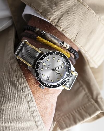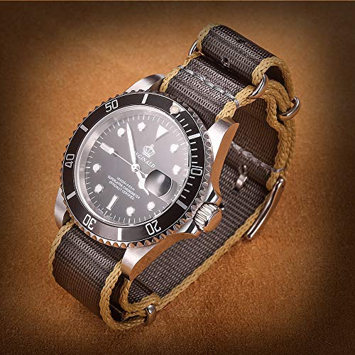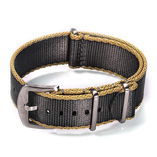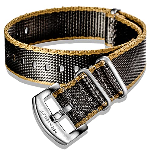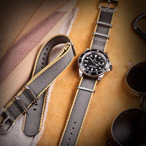 光沢のある厚手のナイロンベルトは丈夫で、高級感もあります。尾錠や金具の塗装を濃くし、金具の幅を狭くすることで、時計を引き立てながらベル
