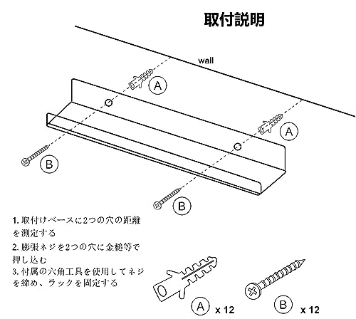 取り付け簡単 壁に穴開ける位置を決める;電動ドリルで穴開け;付属の壁アンカーを穴に挿入します;ネジで棚を固定します。