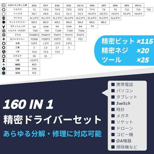 【多種多様な機器に対応】 115個のビットと15種類の工具、20個の精密ネジを備えた完全な精密ドライバーセットで、多様な機種の分解・修理に対応可能です。 iPhone, MacBook, iPad, Nintendo Switch, PS4, PS5, Xbox, PC, コンピューター,メガネ, 時計, タブレット, スマートフォン, パソコンなど、様々な機器を簡単に修理できます。