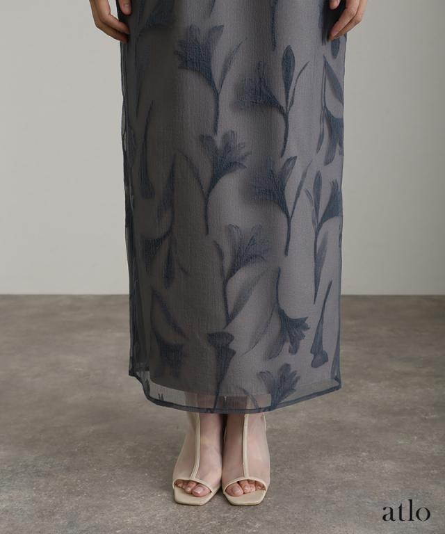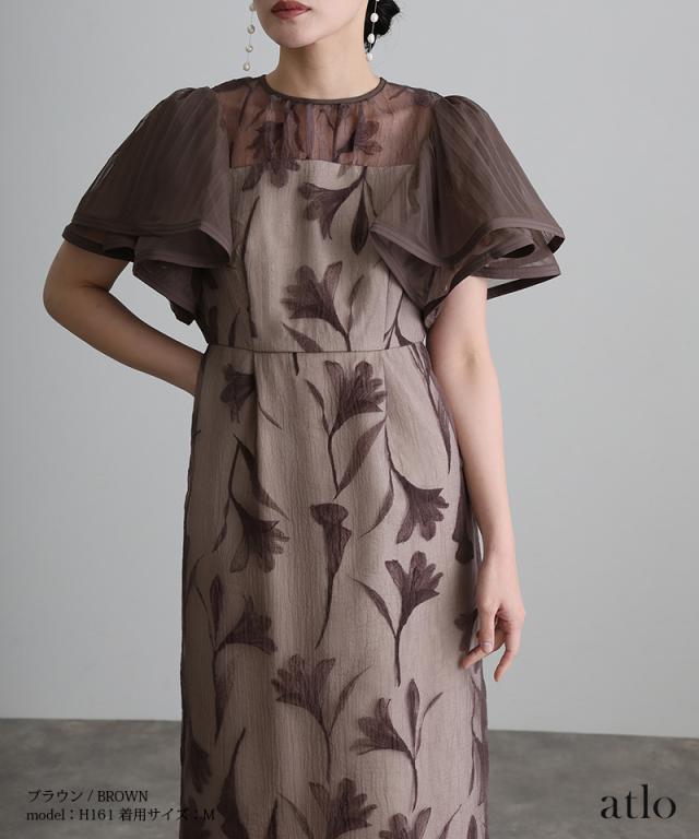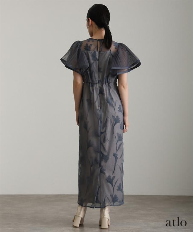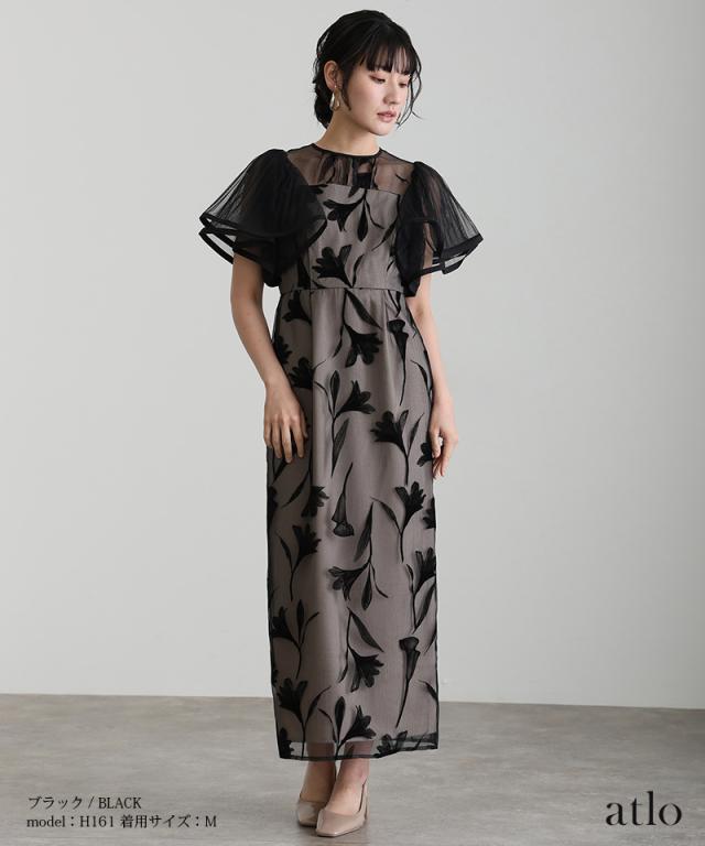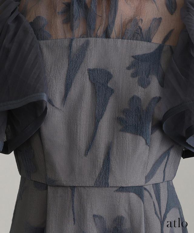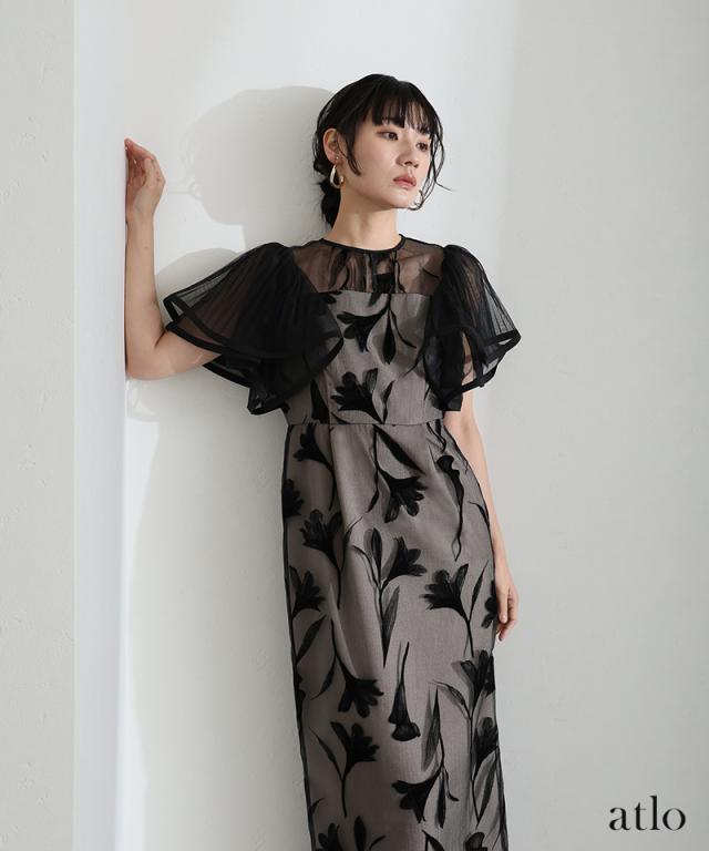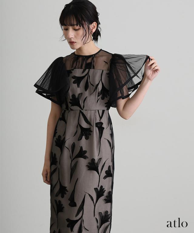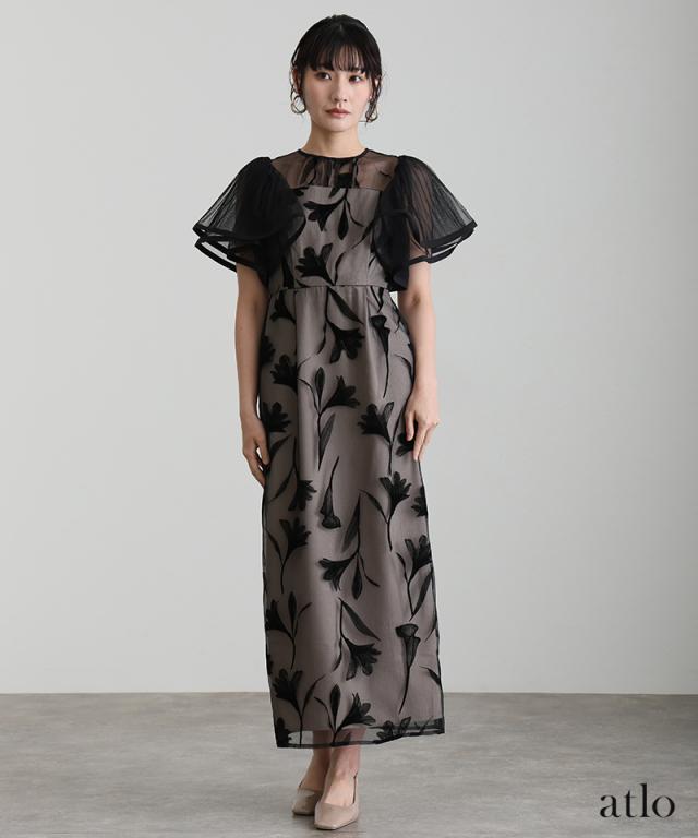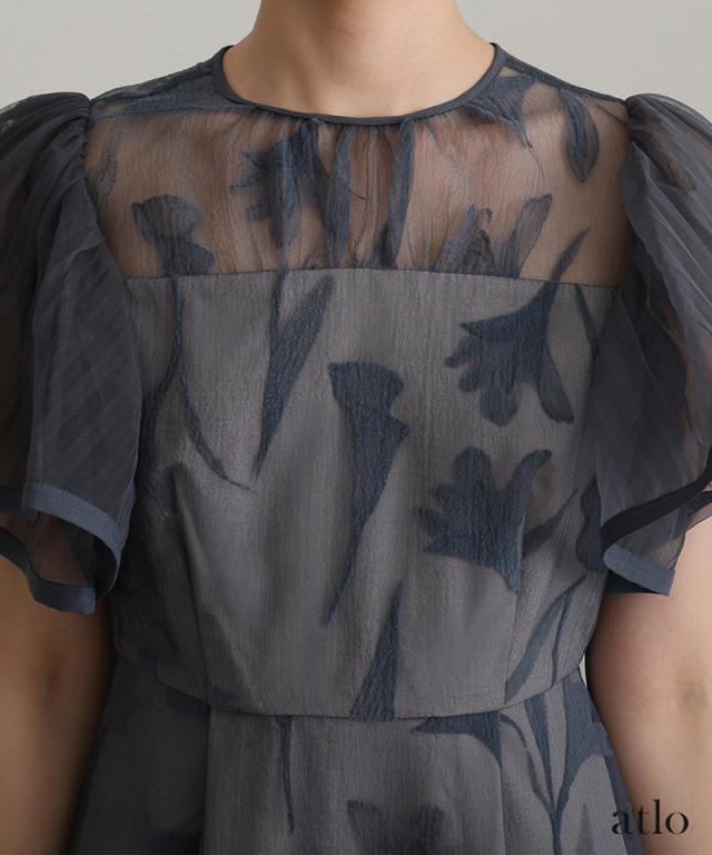 透け感のあるオーガンジーと大胆なフラワー柄が調和した、品格漂うIラインワンピース。