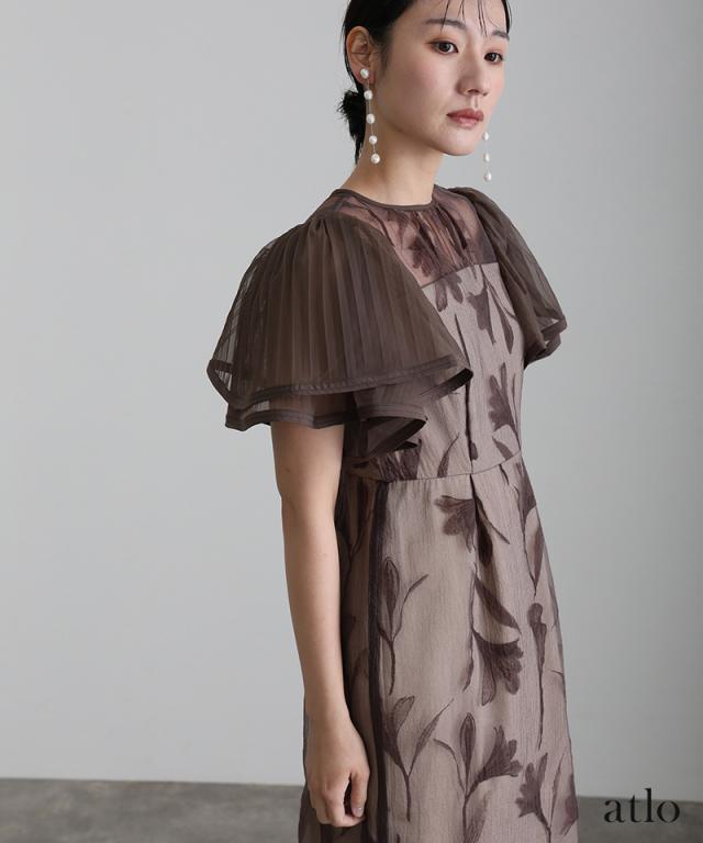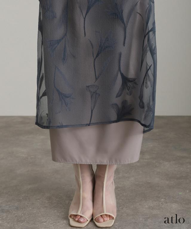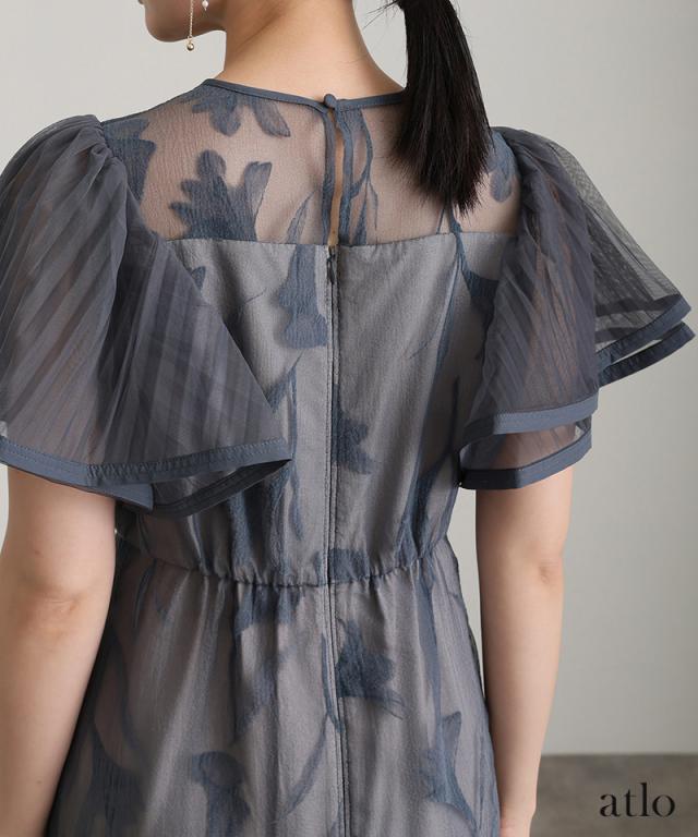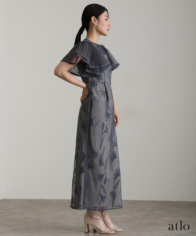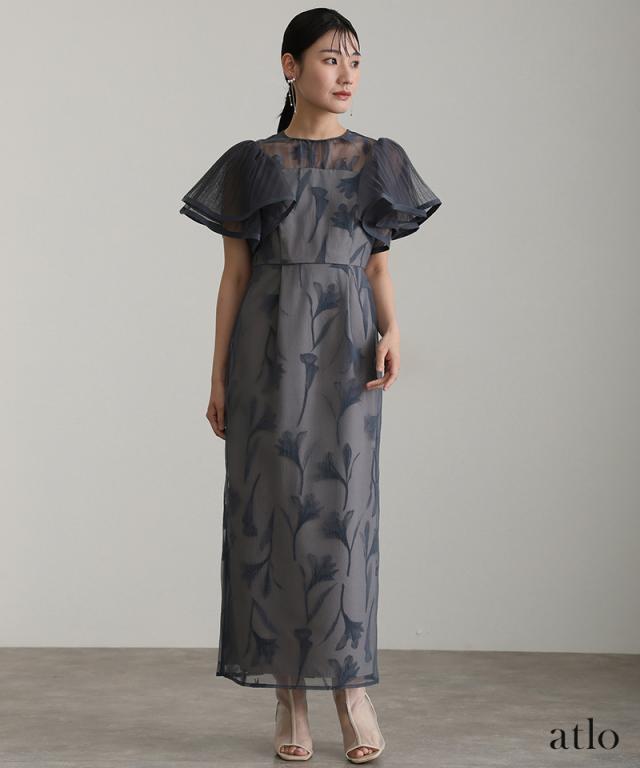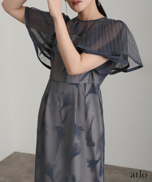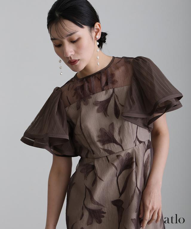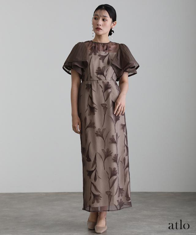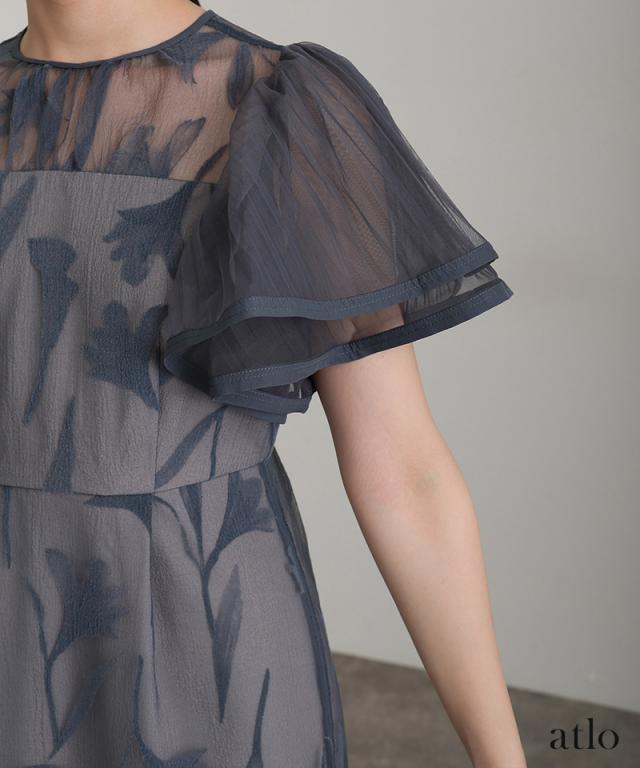 透け感のあるオーガンジーと大胆なフラワー柄が調和した、品格漂うIラインワンピース。