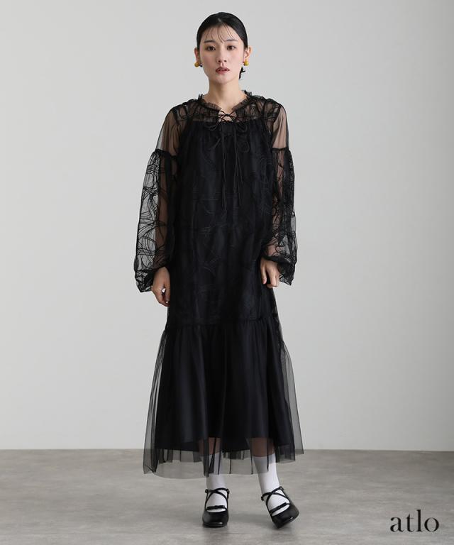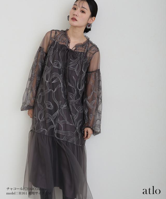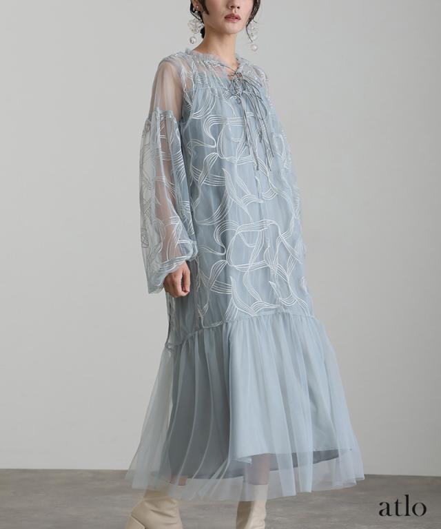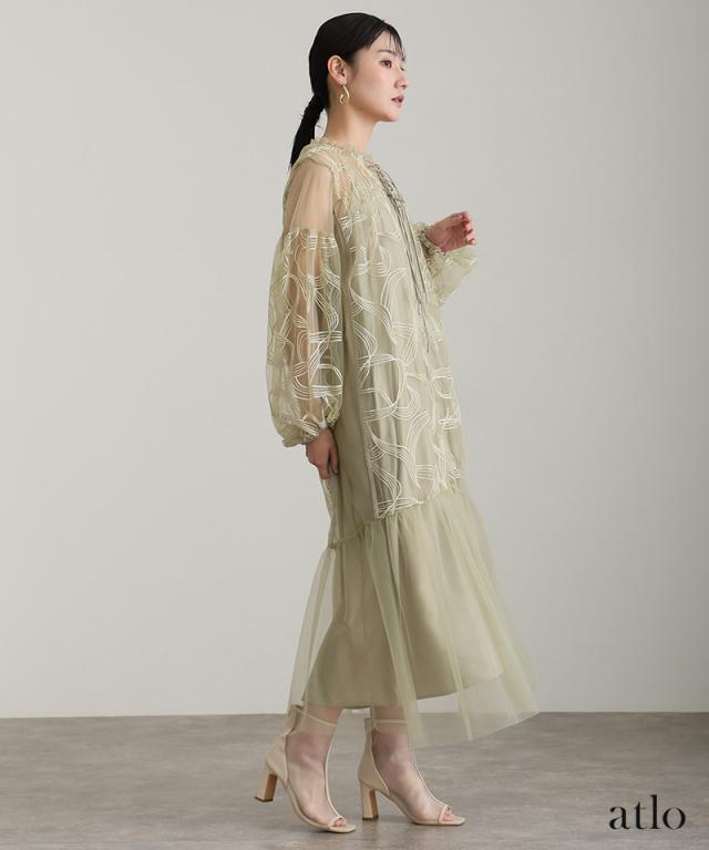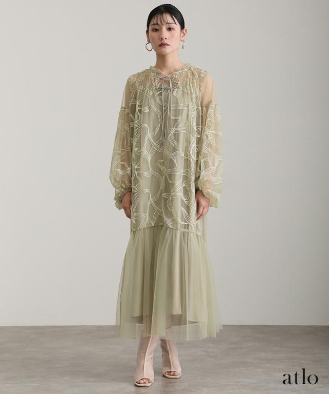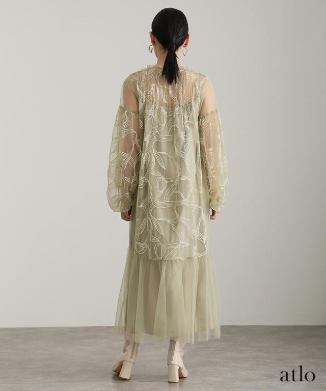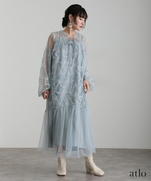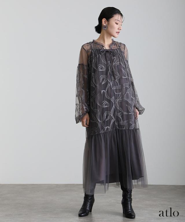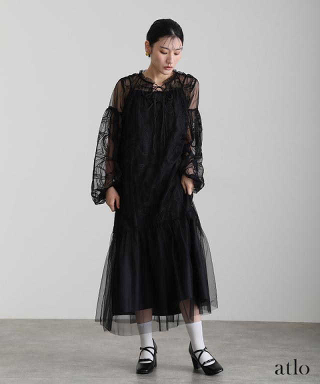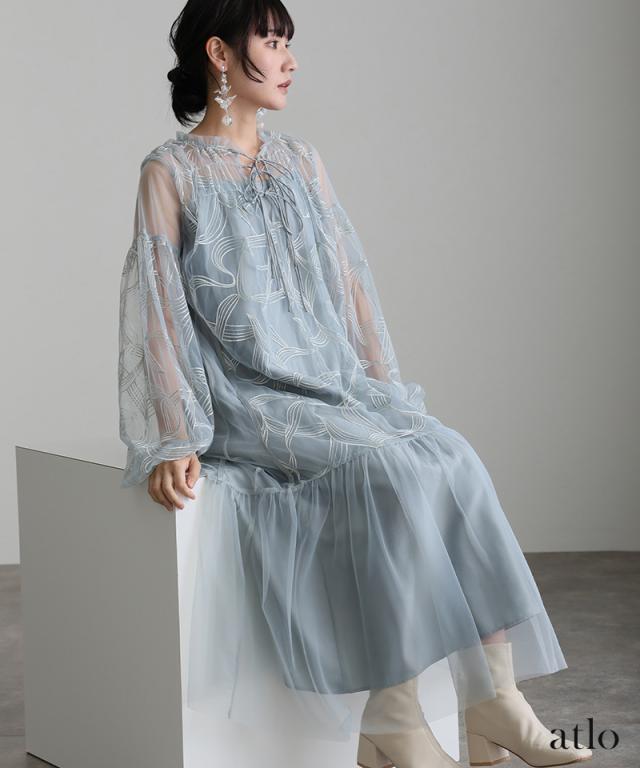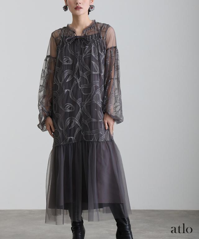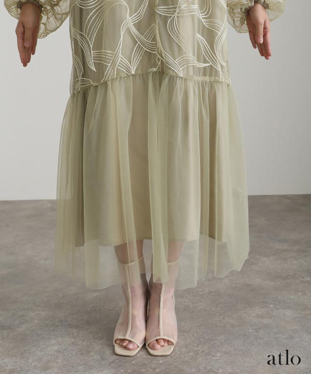 立体感のある刺繍ワンピースにチュールを重ねた、目を惹く華やかさ。