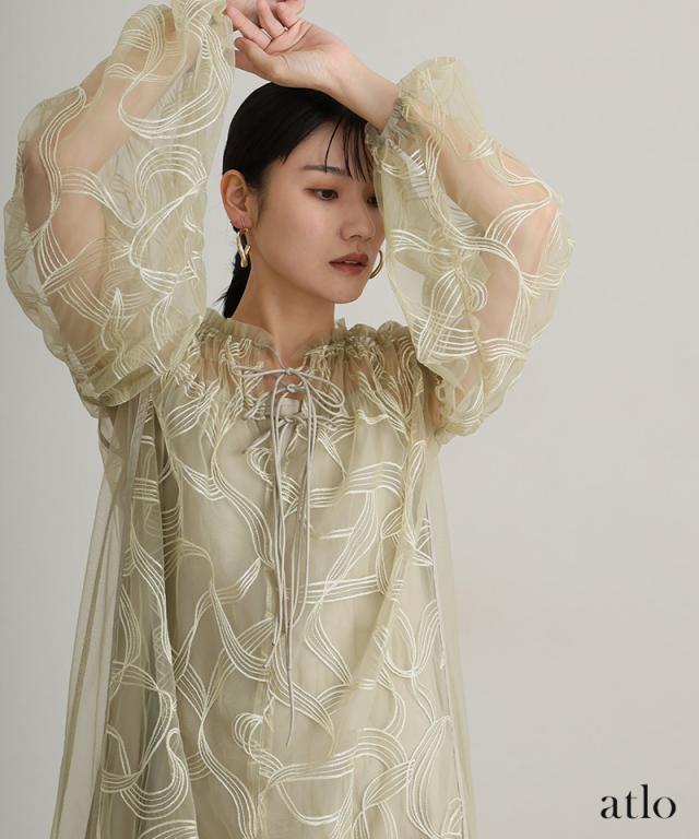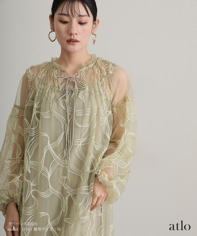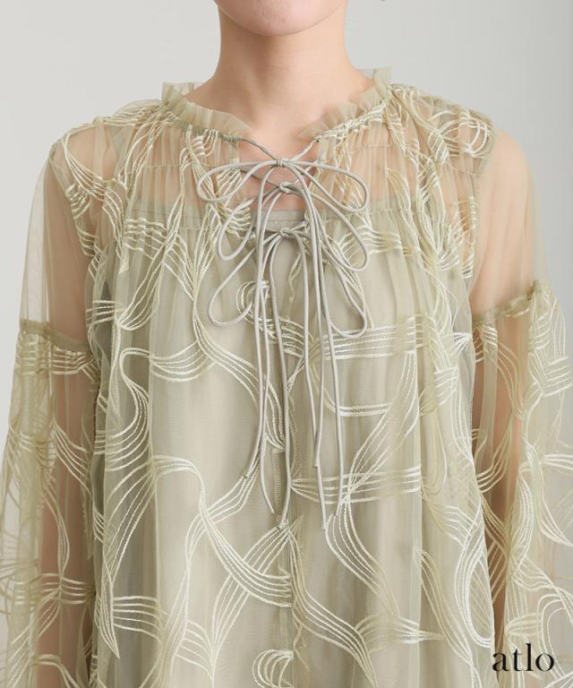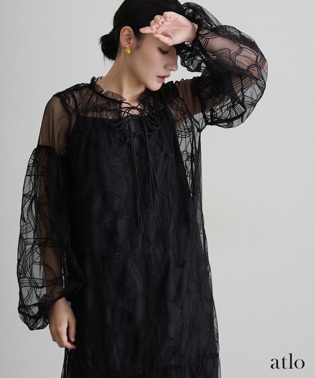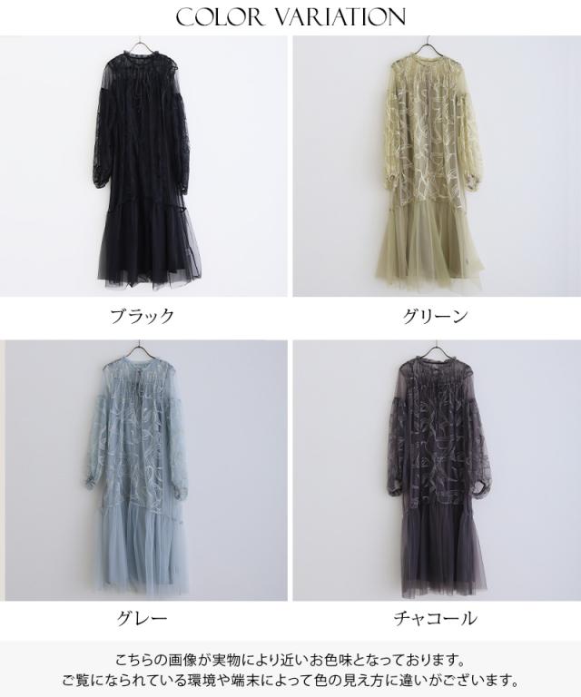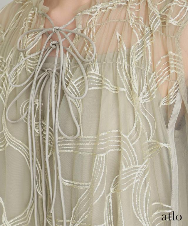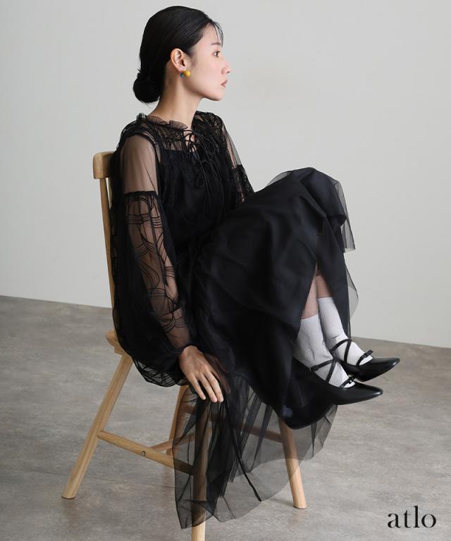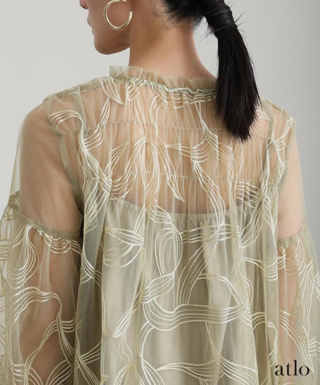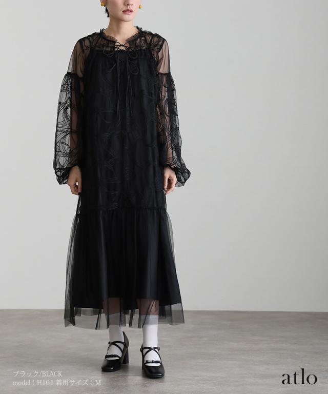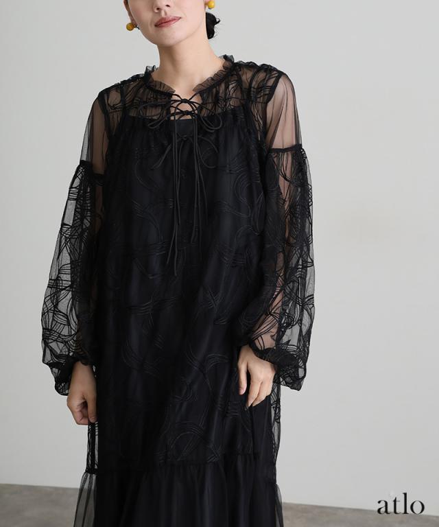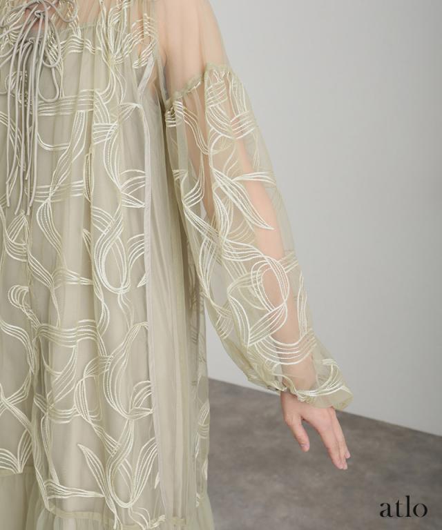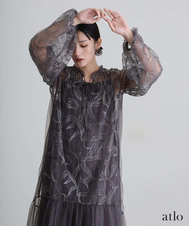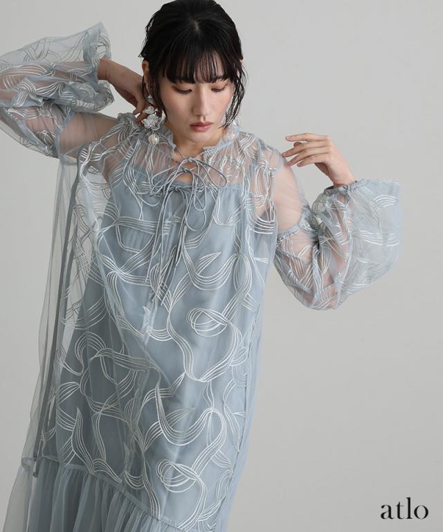 立体感のある刺繍ワンピースにチュールを重ねた、目を惹く華やかさ。